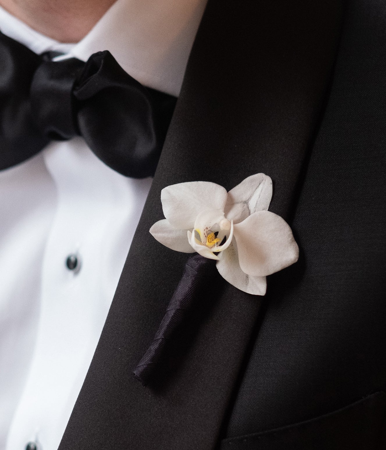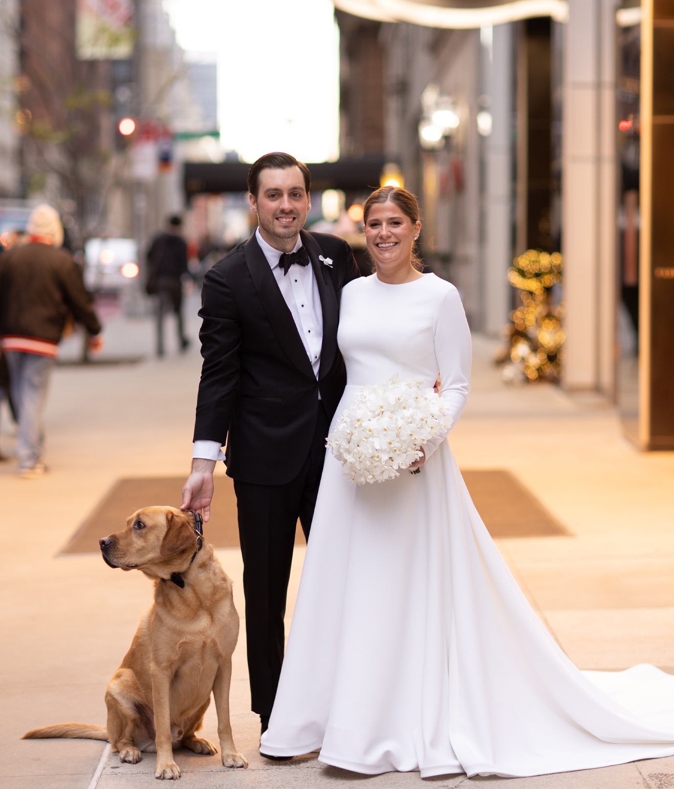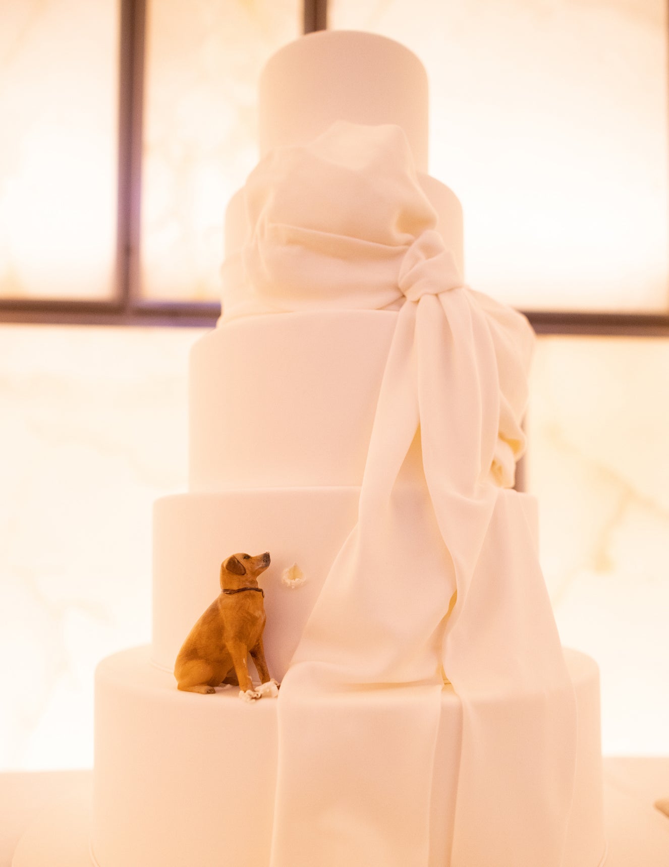 The bride, a vision of grace, carried hundreds of miniature white Phalaenopsis Orchids, their delicate florets fluttering like butterflies. Though everyone hoped their beloved Yellow Labrador would join the festivities, he made a charming appearance during the photo session at the front door, and his presence inspired the design of the wedding cake.
