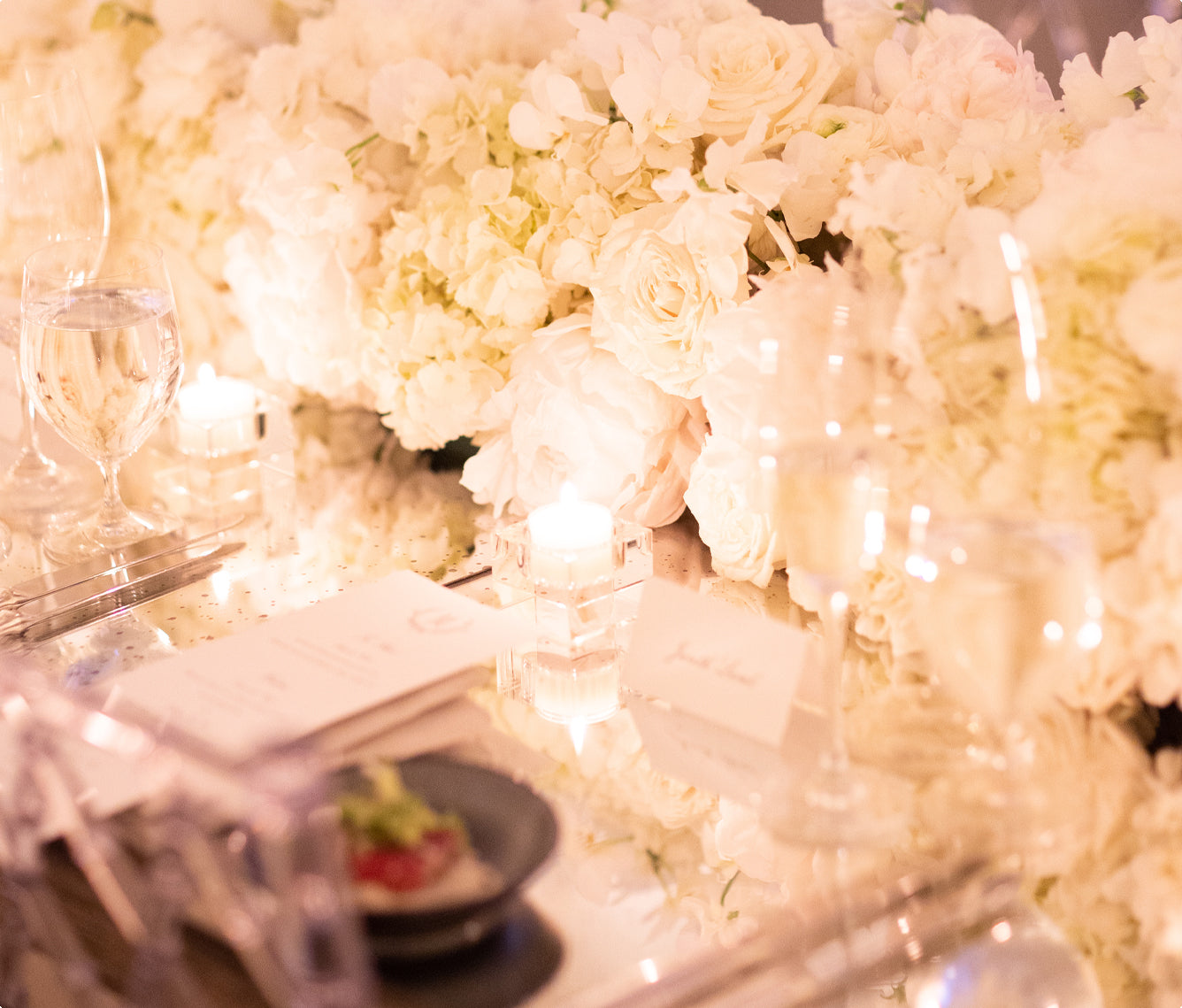 The reception tables were a study in understated luxury. Custom mercury glass mirrored tables were adorned with floral runners that stretched elegantly down the center. The pristine winter whites including lush Hydrangea, fluffy Peonies, delicate Sweet Peas, classic Roses, and button Ranunculus, arranged in perfect harmony, creating an atmosphere of serene elegance reflecting the season’s quiet beauty and the couple’s impeccable taste.