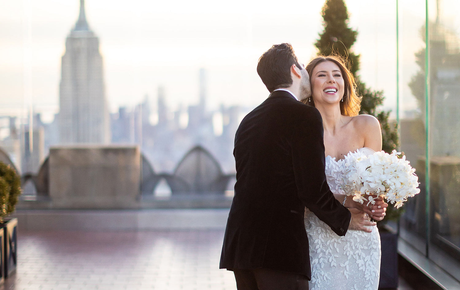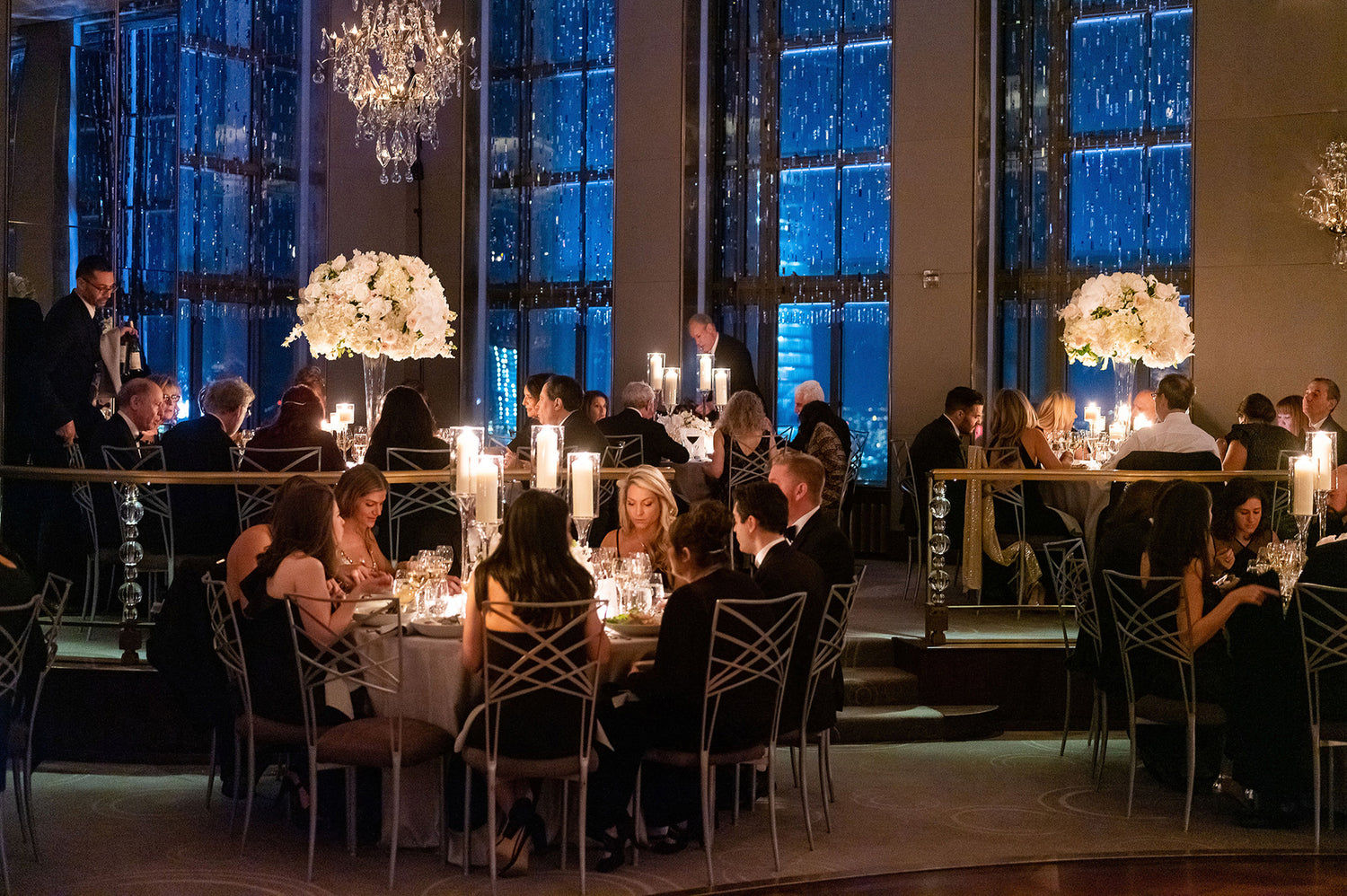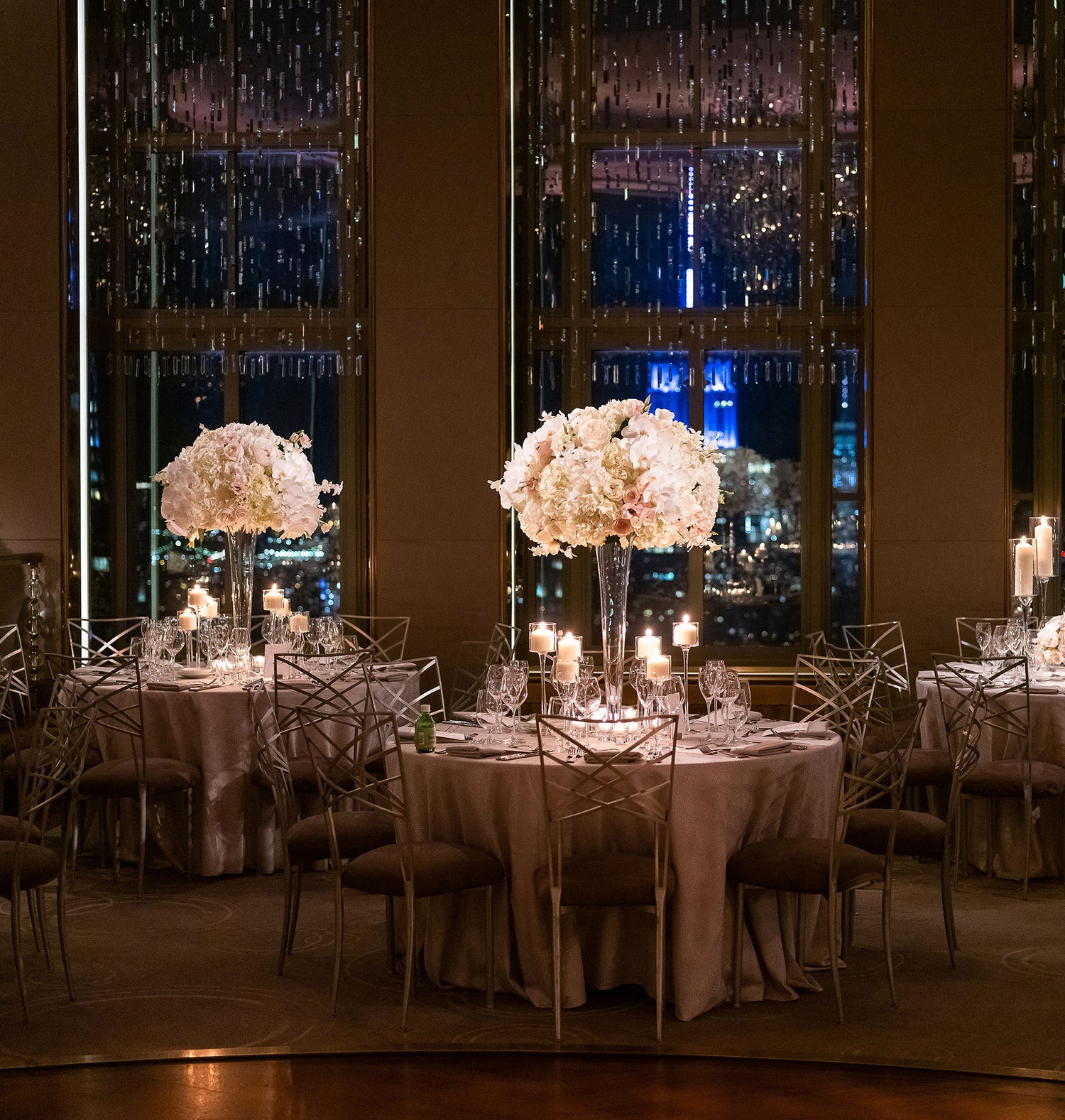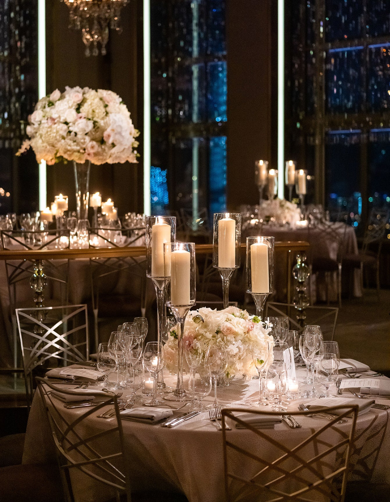 Perched atop the city at The Rainbow Room, a quintessential Art Deco gem, this couple's celebration mirrored the breathtaking views below. The crystal droplets from the windows sparkled against the skyline, while glass trumpet vases and footed bowls, filled with clouds of flowers in soft whites, ivories, and champagne, seemed to mimic the very clouds drifting in the sky. Lush Hydrangeas, fluffy Peonies, fully bloomed Roses and sexy Orchids, romantic, and modern, formed stunning centerpieces, their beauty illuminated by twinkling candles at eye level.
