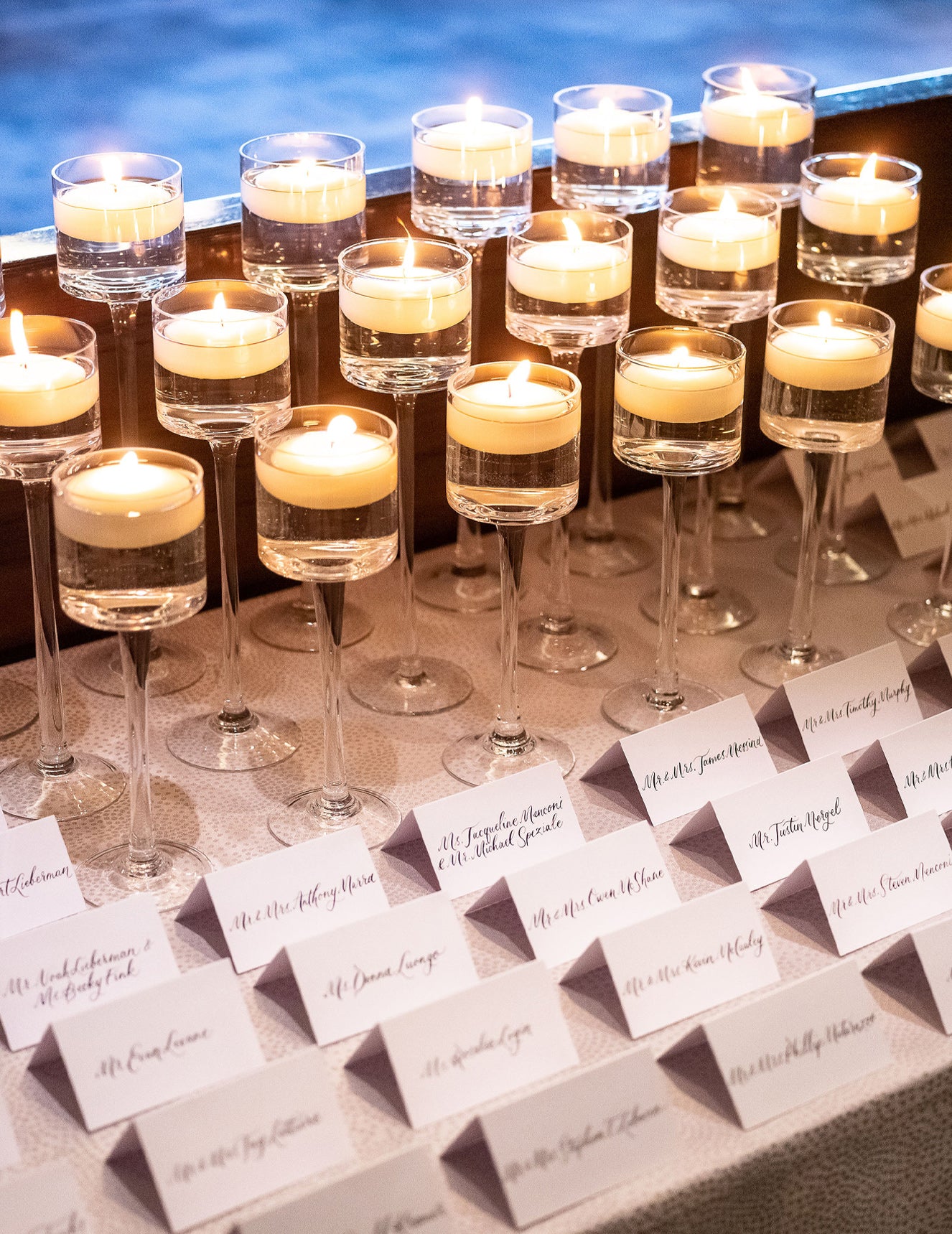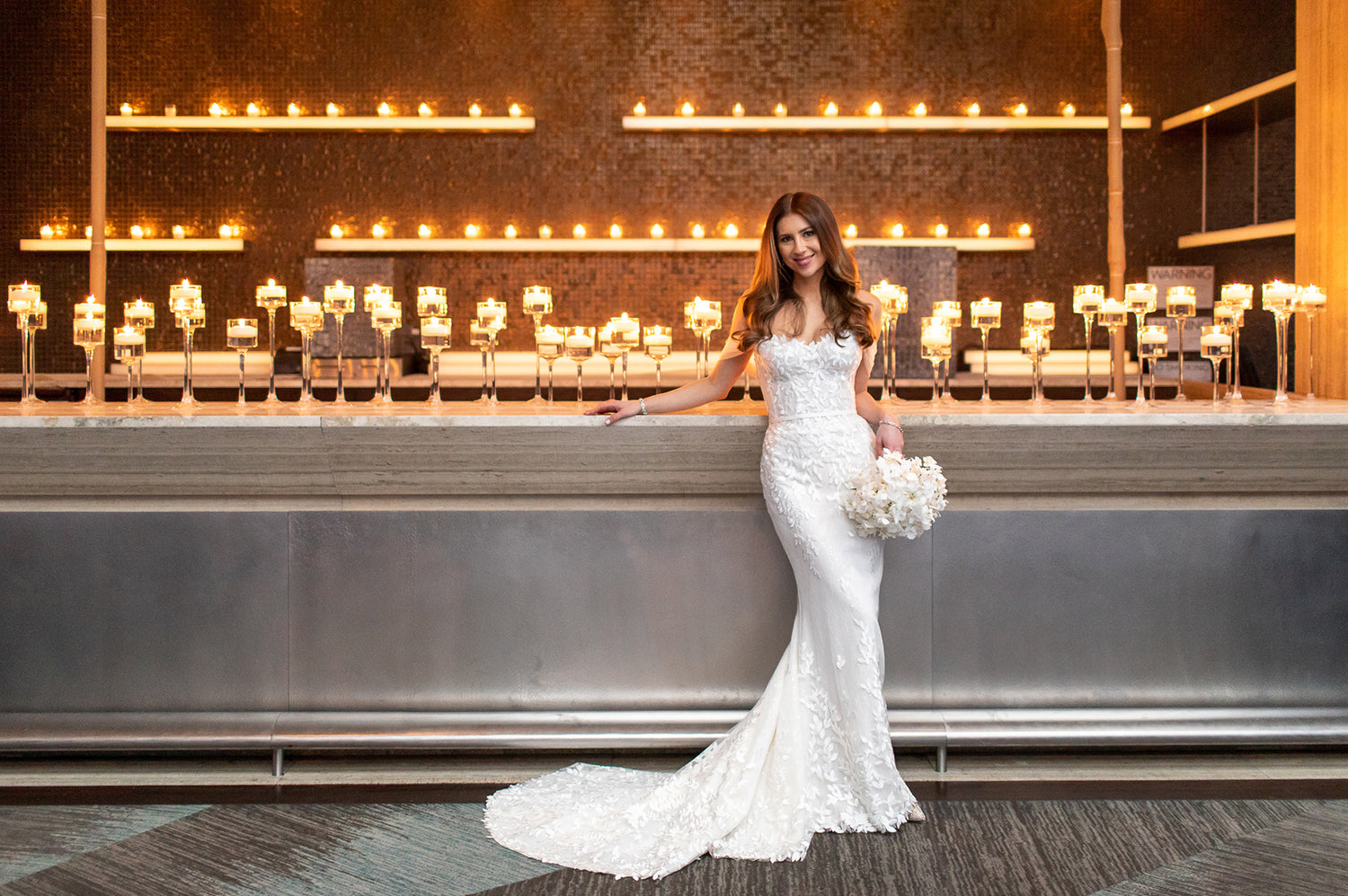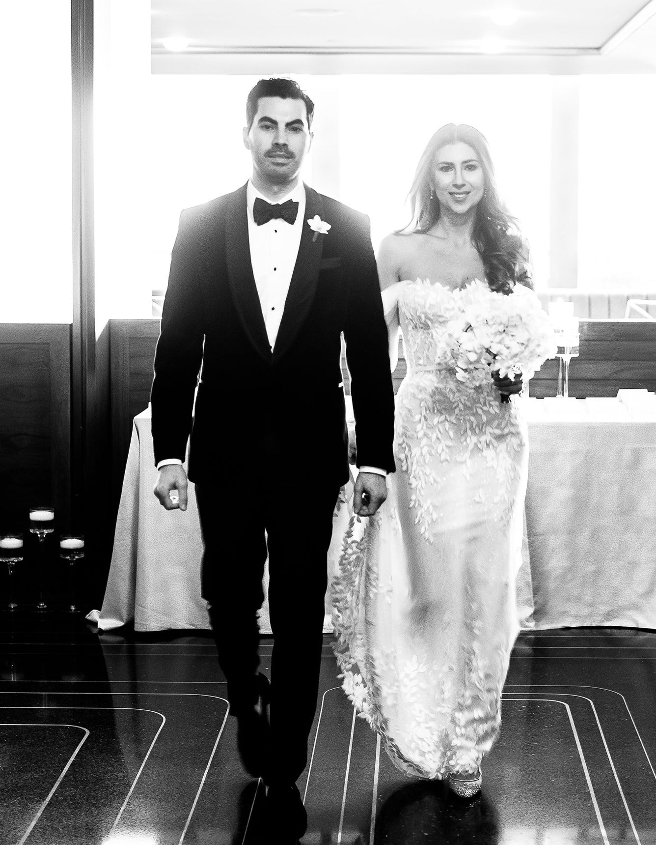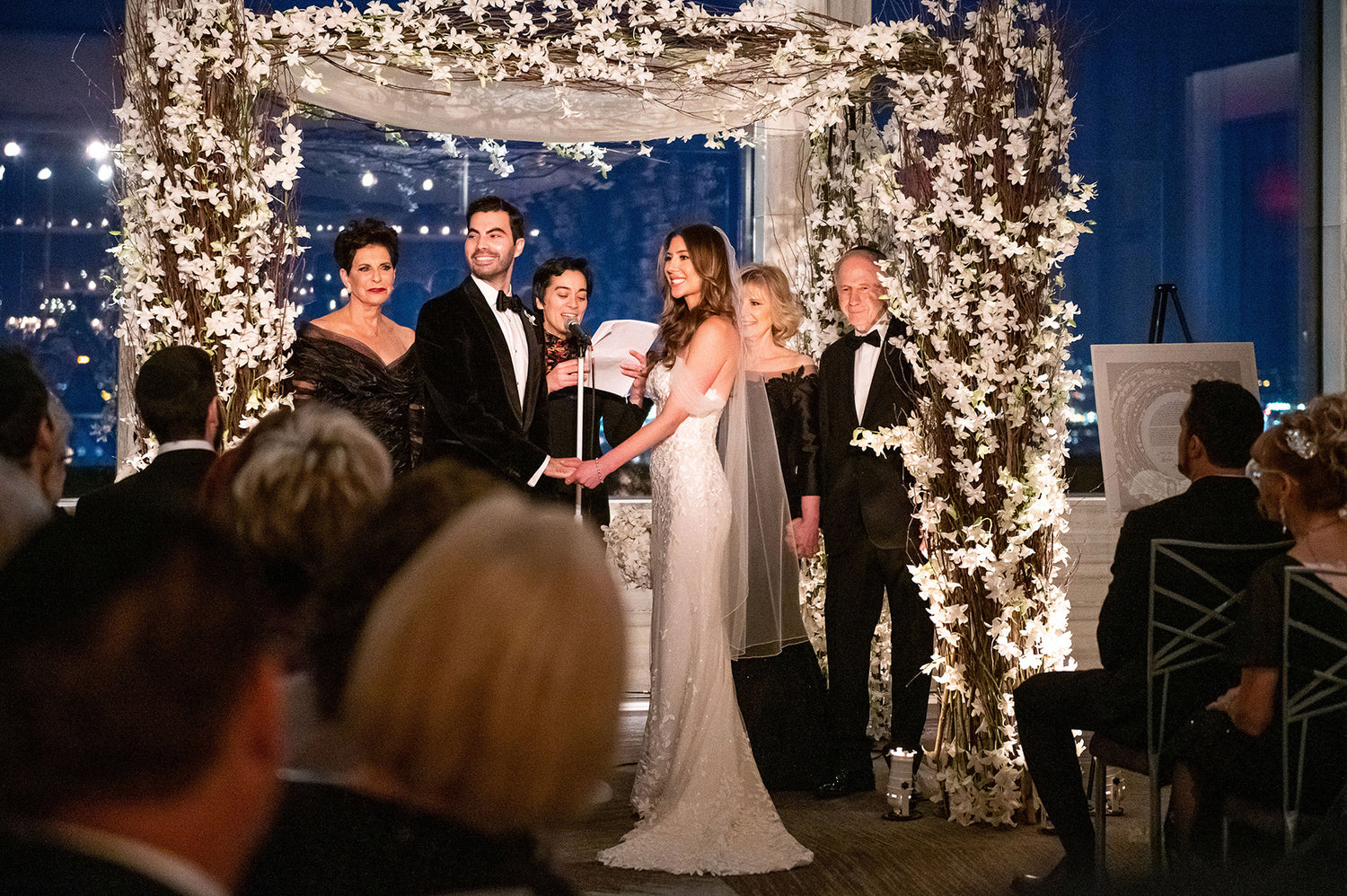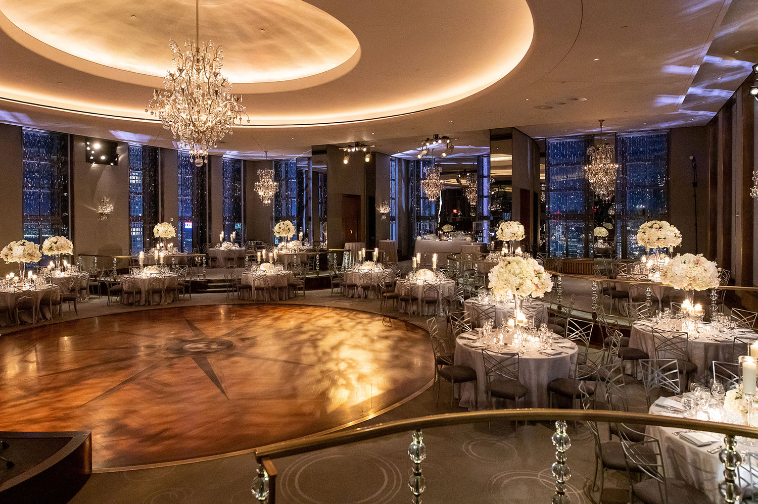 Perched atop the city at The Rainbow Room, a quintessential Art Deco gem, this couple's celebration mirrored the breathtaking views below. The crystal droplets from the windows sparkled against the skyline, while glass trumpet vases and footed bowls, filled with clouds of flowers in soft whites, ivories, and champagne, seemed to mimic the very clouds drifting in the sky. Lush Hydrangeas, fluffy Peonies, fully bloomed Roses and sexy Orchids, romantic, and modern, formed stunning centerpieces, their beauty illuminated by twinkling candles at eye level.