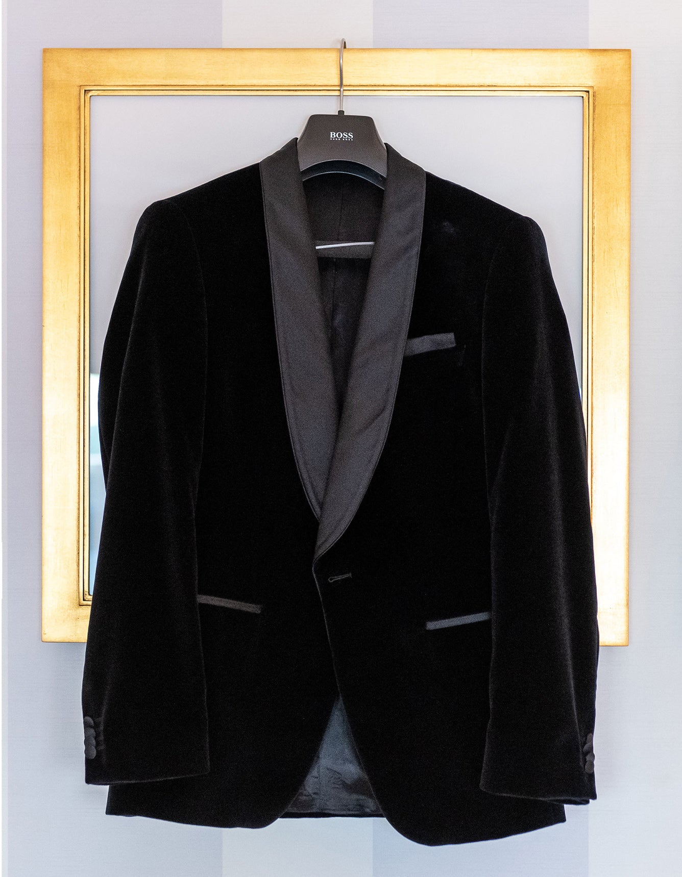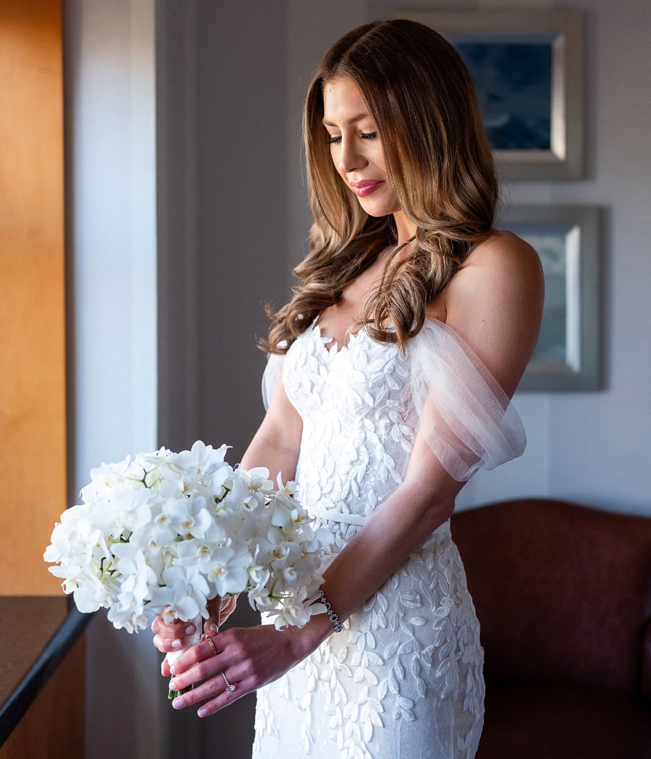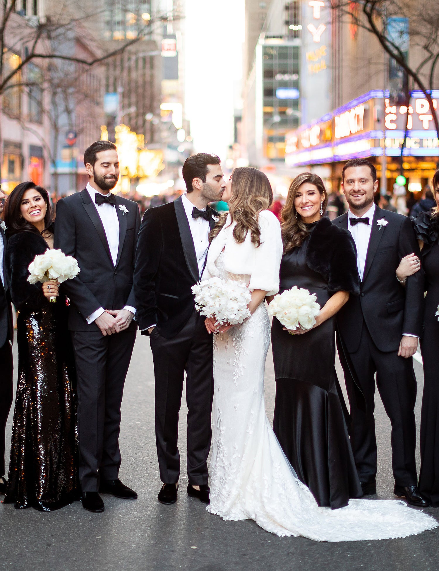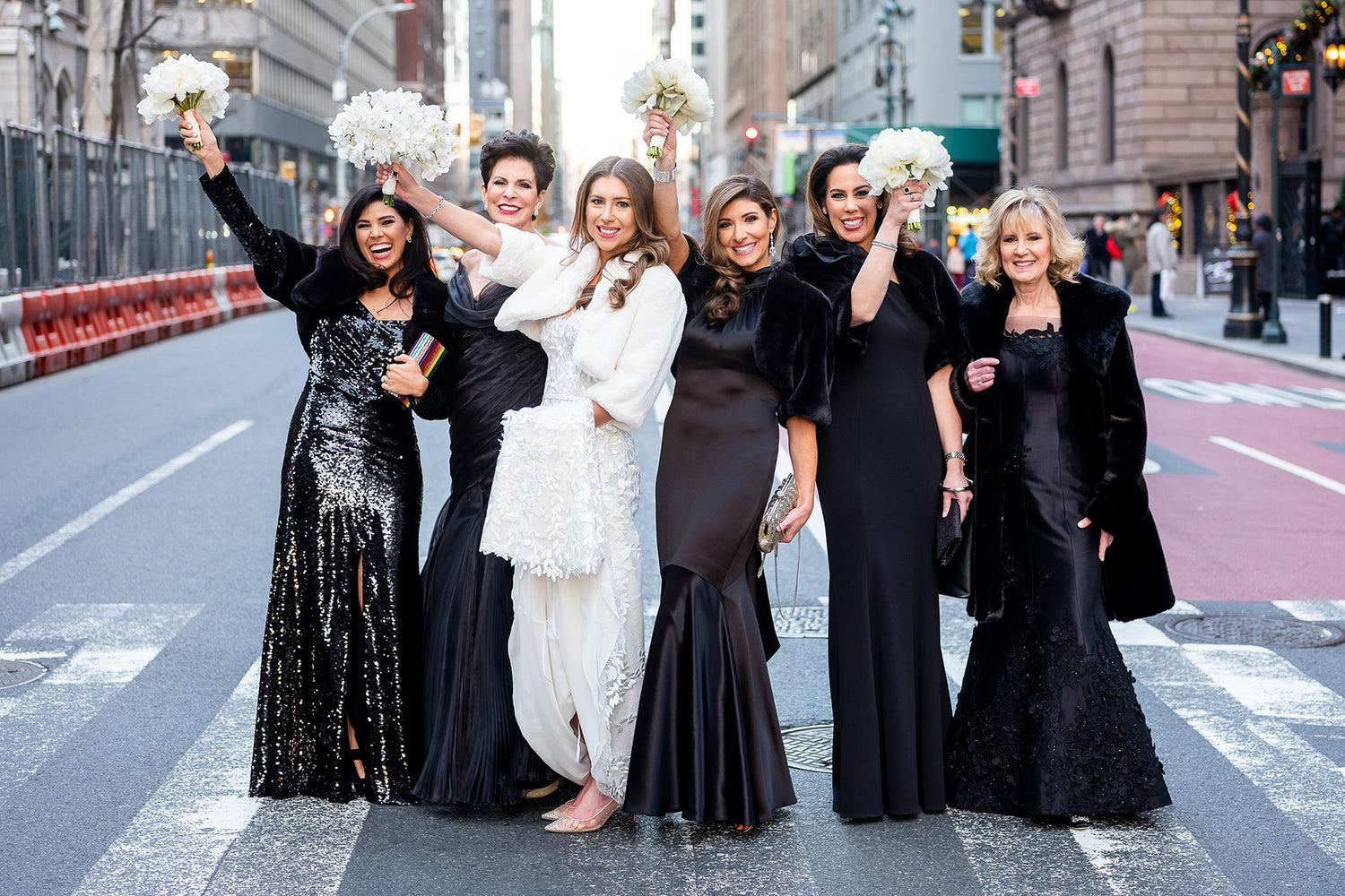 For the bride, Orchids were a must. Her bouquet, a stunning collection of hundreds of miniature Phalaenopsis blossoms, fluttered like delicate butterflies in her hands. The groom, equally dapper in a black velvet tuxedo jacket, sported a matching miniature Phalaenopsis Orchid boutonniere, completing the elegant look. The bride, dressed in timeless elegance, was joined by her glamorous entourage, all in black, as they strutted down Fifth Avenue, powerhouse women on their way to celebrate a love as bold and glamorous as the city itself.