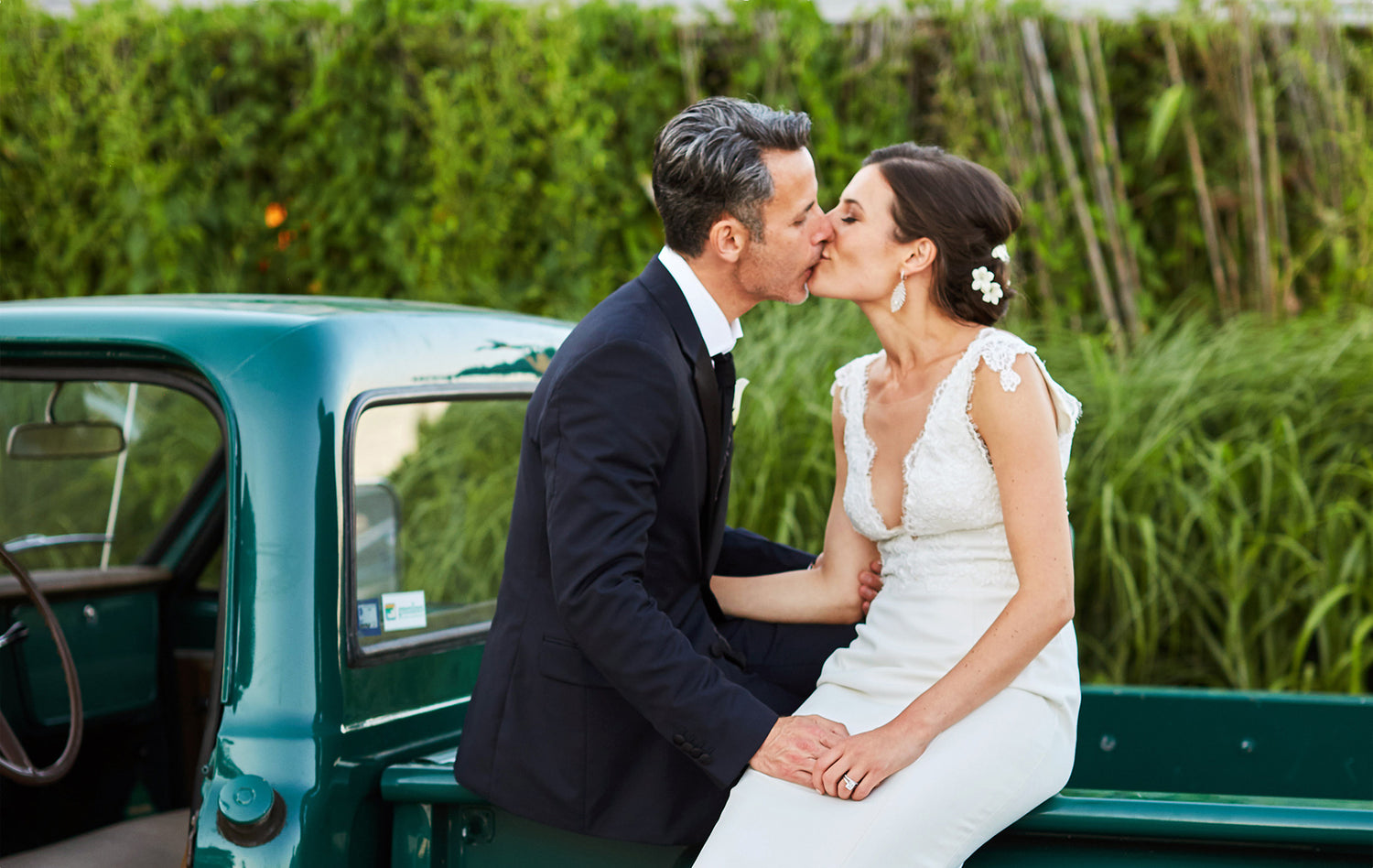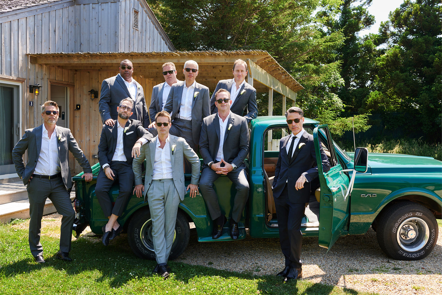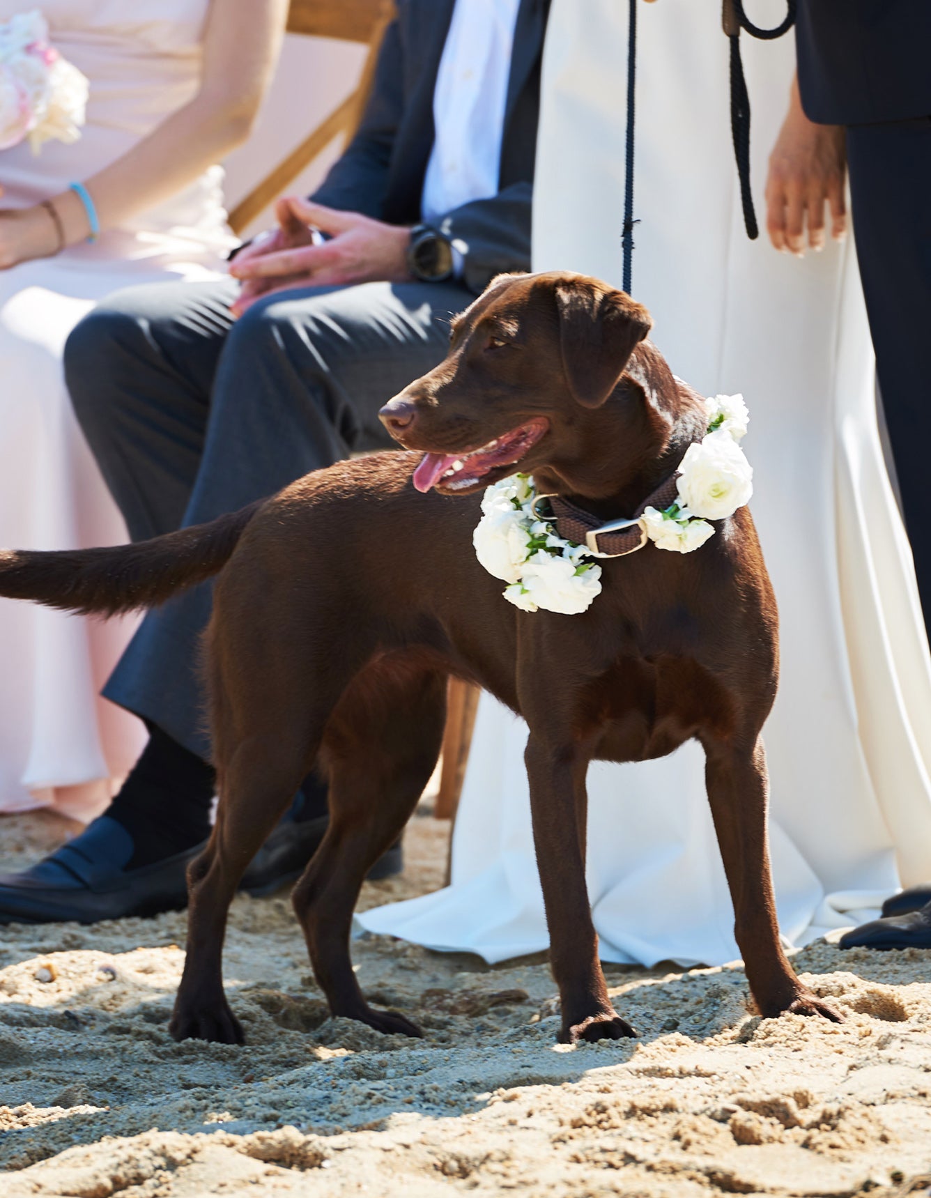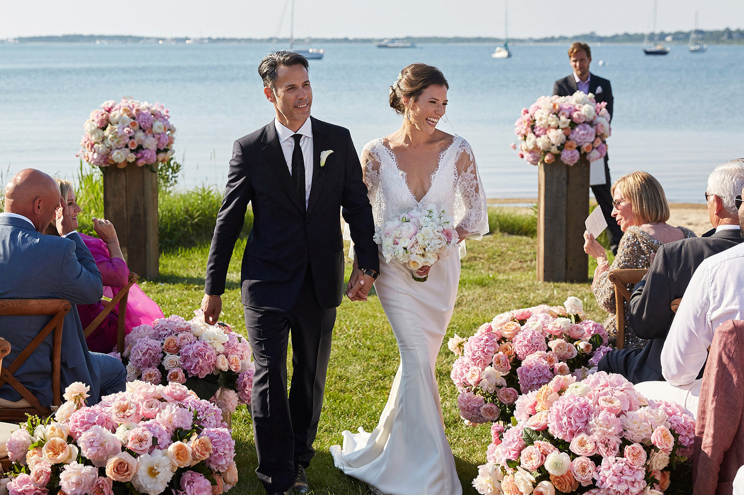 On the sun-drenched beaches of the Hamptons, this couple’s wedding was a perfect blend of effortless elegance and laid-back coolness. The wedding party arrived in green pickup trucks, the bridesmaids in soft blush satin slip dresses and the groomsmen in relaxed charcoal linen suits. The bride, a vision of grace, wore tiny Stephanotis blossoms tucked into her hair and carried a feminine bouquet of soft pink and white florets, an embodiment of the blushing bride’s carefree spirit. Their Chocolate Lab, too, became a star of the day, donning a garland of roses around his neck, adding a playful touch to the scene.