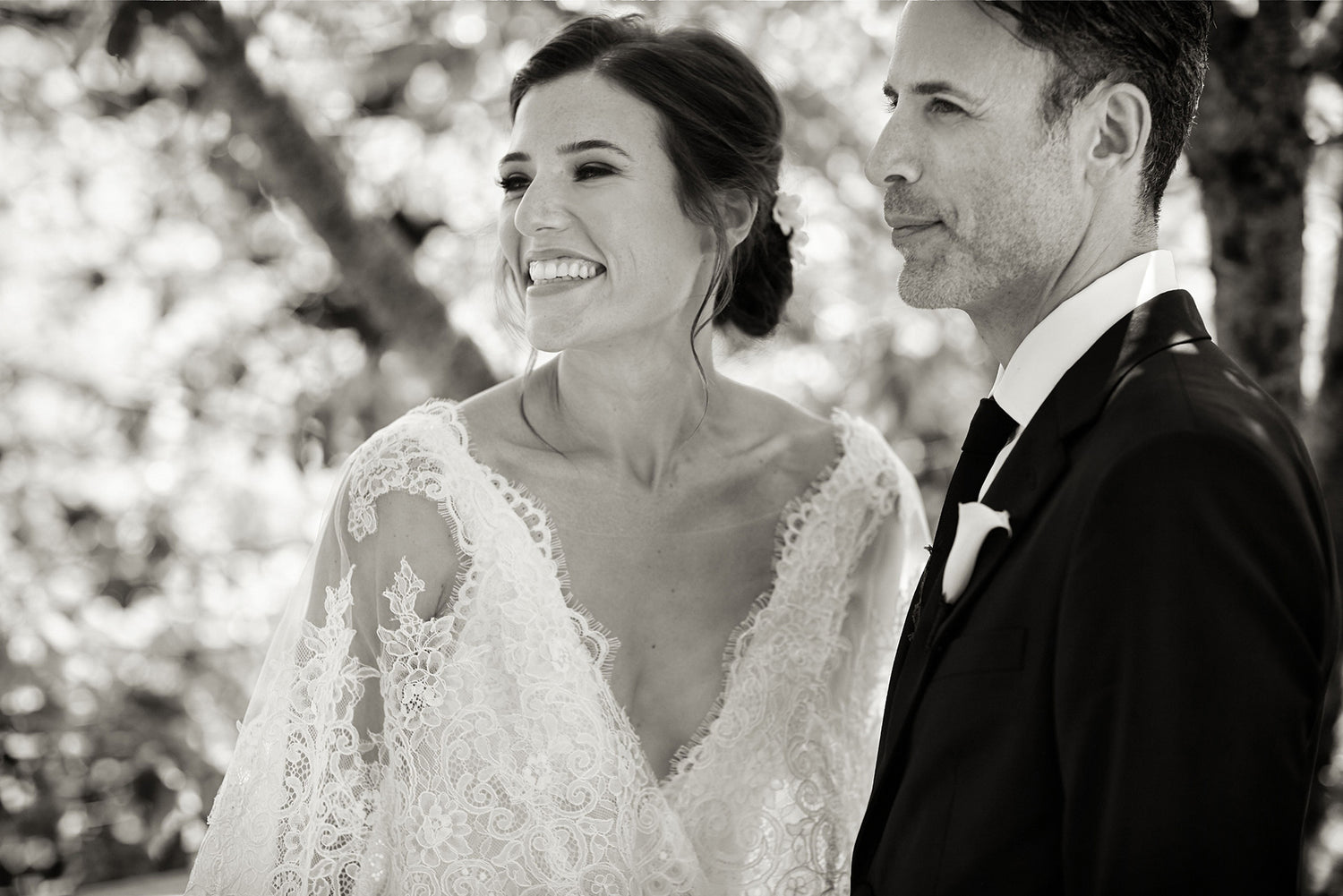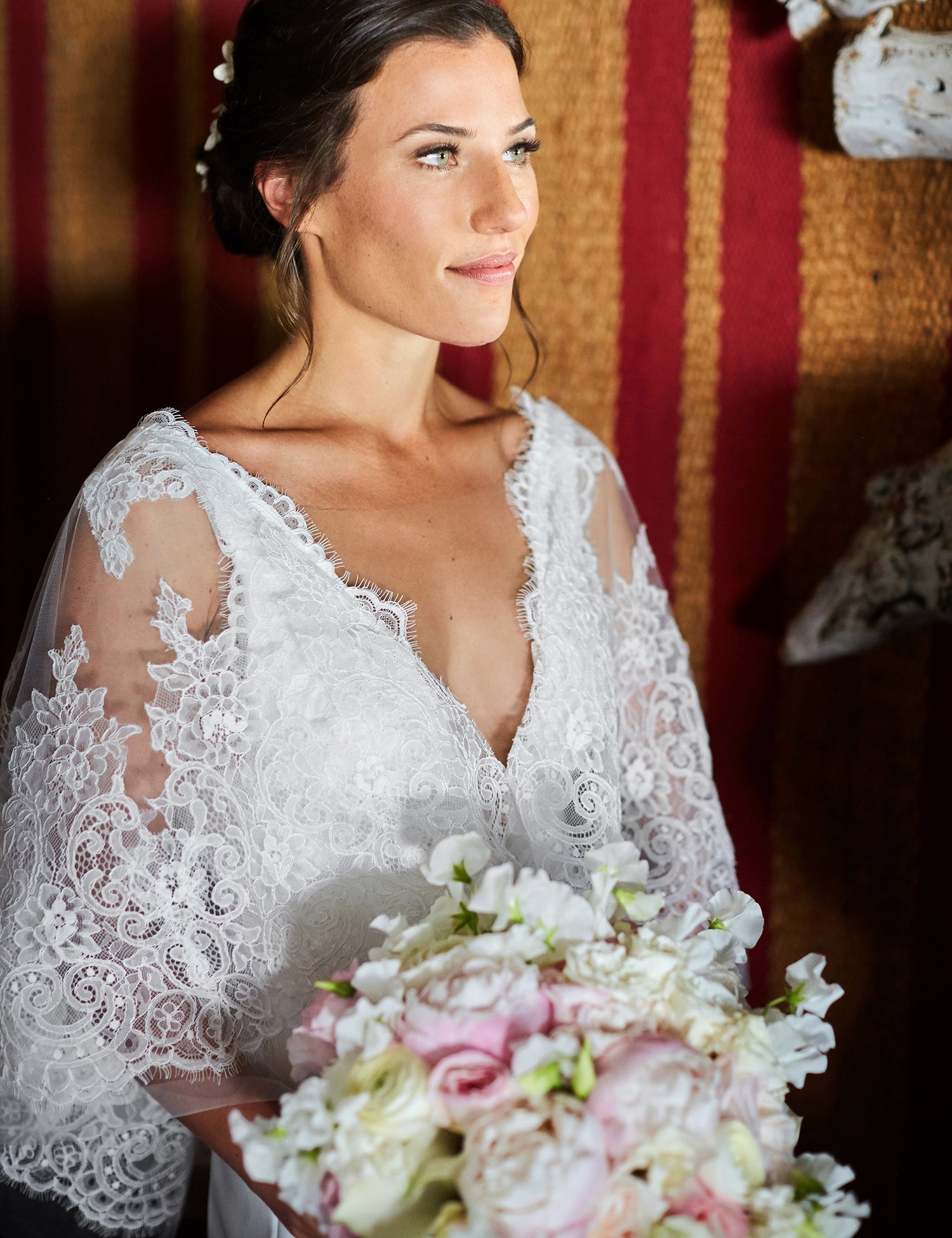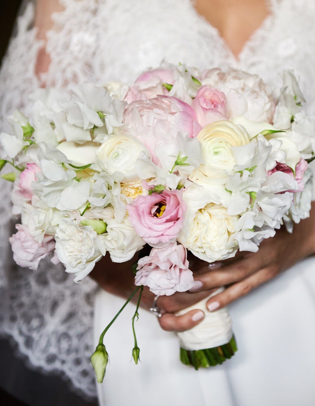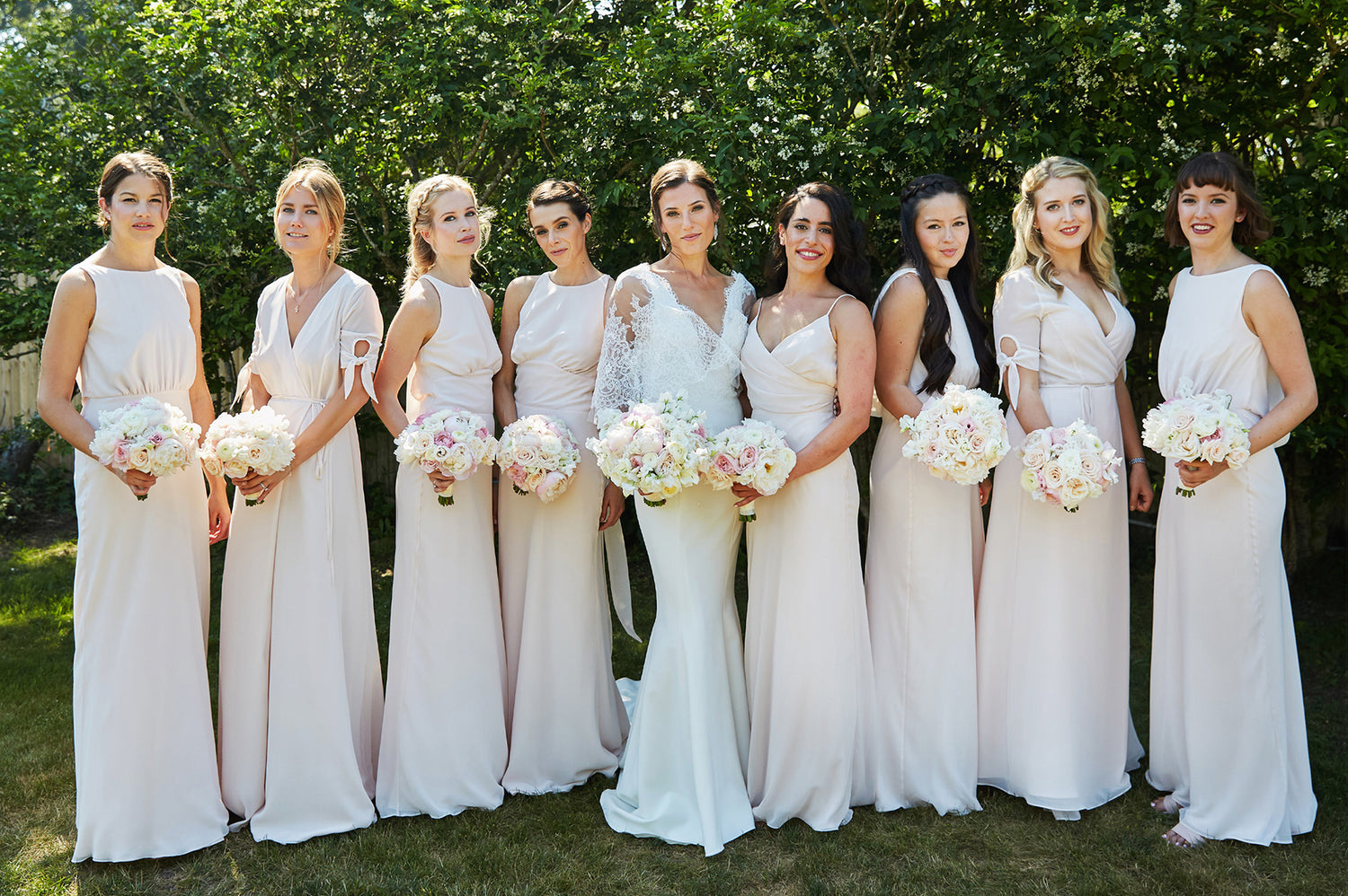 On the sun-drenched beaches of the Hamptons, this couple’s wedding was a perfect blend of effortless elegance and laid-back coolness. The wedding party arrived in green pickup trucks, the bridesmaids in soft blush satin slip dresses and the groomsmen in relaxed charcoal linen suits. The bride, a vision of grace, wore tiny Stephanotis blossoms tucked into her hair and carried a feminine bouquet of soft pink and white florets, an embodiment of the blushing bride’s carefree spirit. Their Chocolate Lab, too, became a star of the day, donning a garland of roses around his neck, adding a playful touch to the scene.