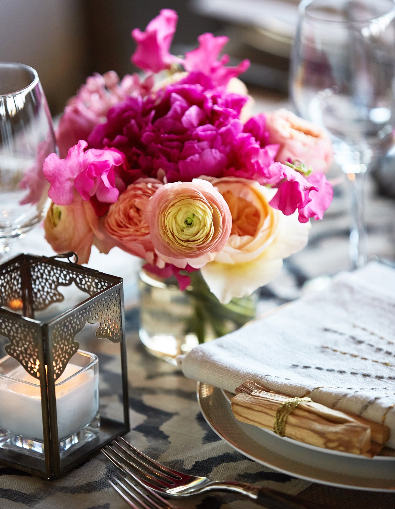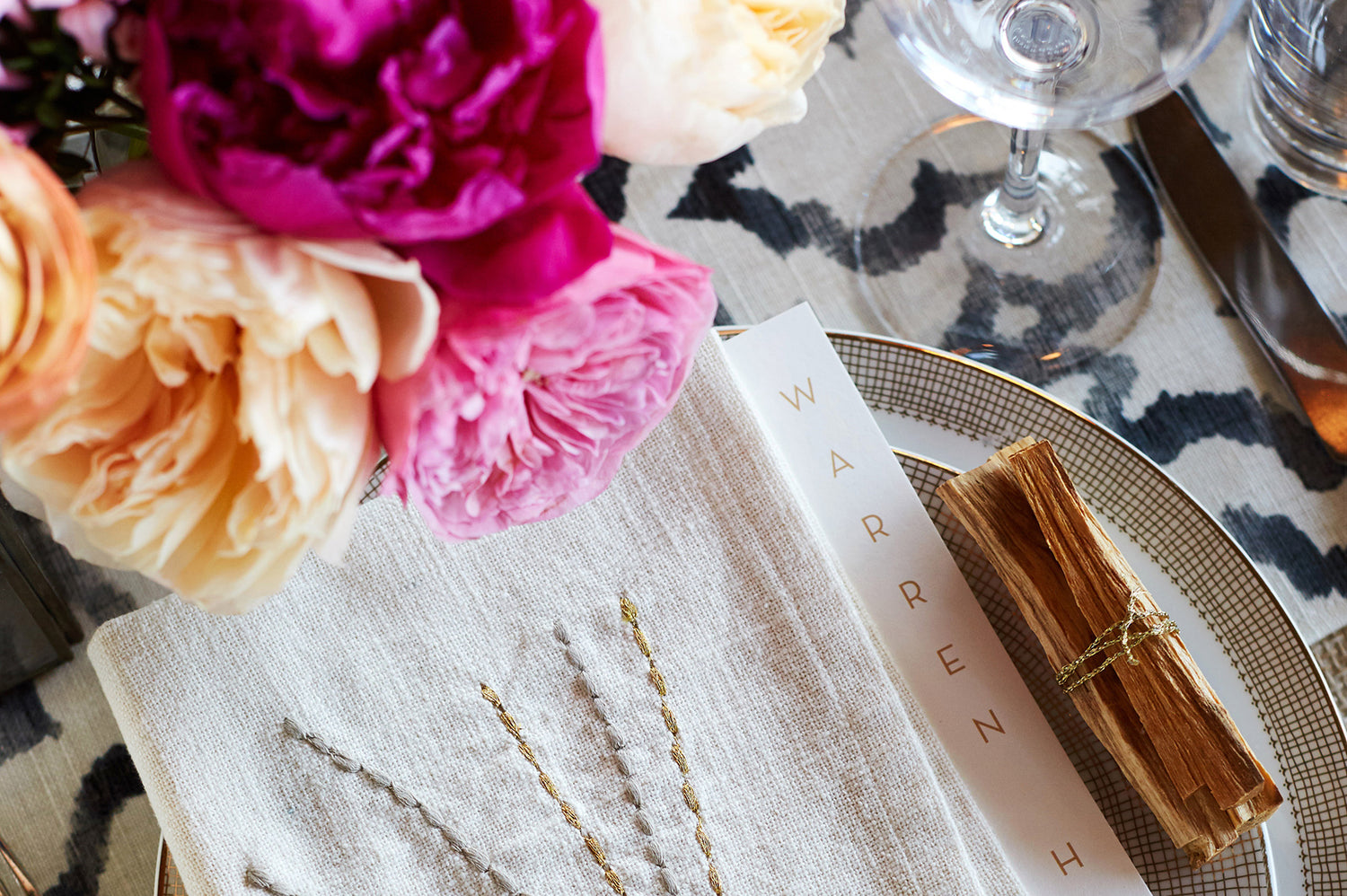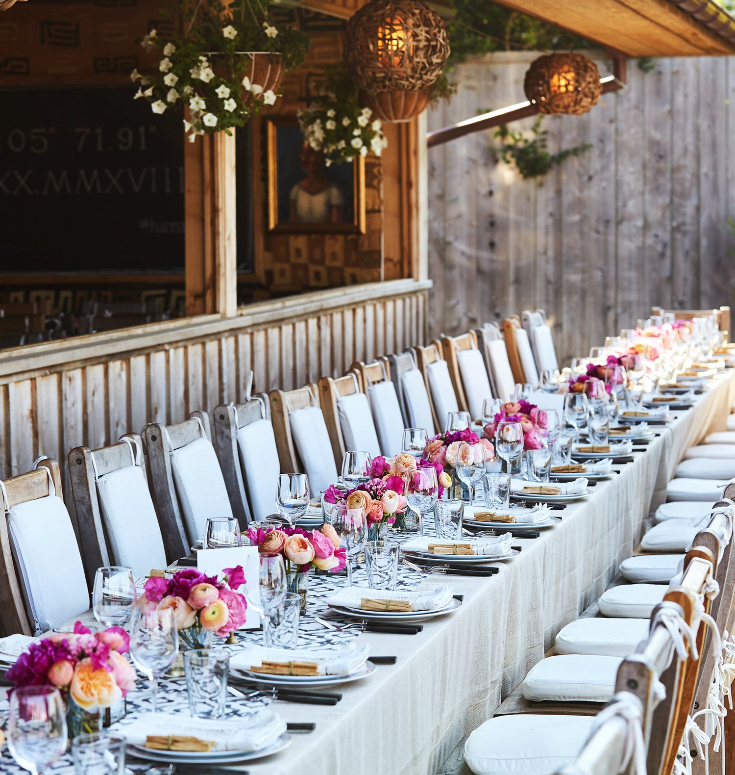 The celebration continued at Crow’s Nest, one of Montauk's most coveted hotspots, with a reception set against the breathtaking view of the New York Sound. Driftwood wooden boxes, filled with pink and peach blooms, offered a casual yet refined ceremony vibe for the grassy lawn. Inside, dinner tables were dressed in black-and-white Ikat patterned linen runners, accented with vibrant hot pink, peach, and coral flowers, reflecting the hues of the summer sunset. Moroccan votive candles flickered softly, while embroidered linen napkins were folded with Palo Santo sticks, a keepsake for the guests. To complete the sensory experience, Belle Fleur’s Aeromyst technology infused the air with the earthy scent of Palo Santo, creating a fragrant atmosphere that enveloped the venue as guests rocked the night away.