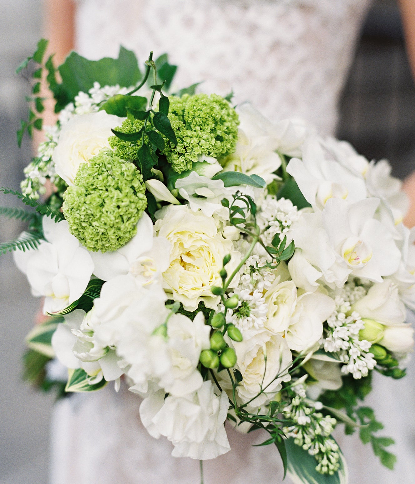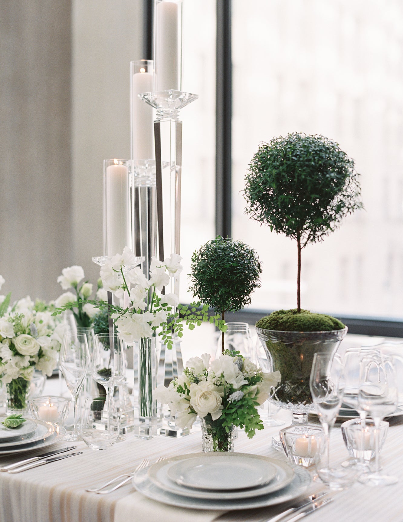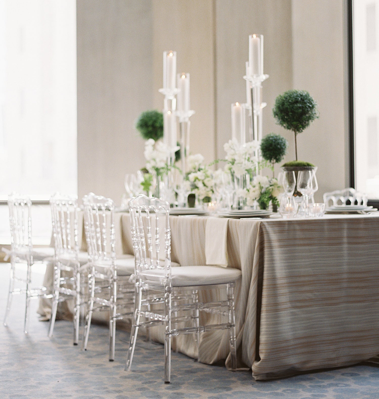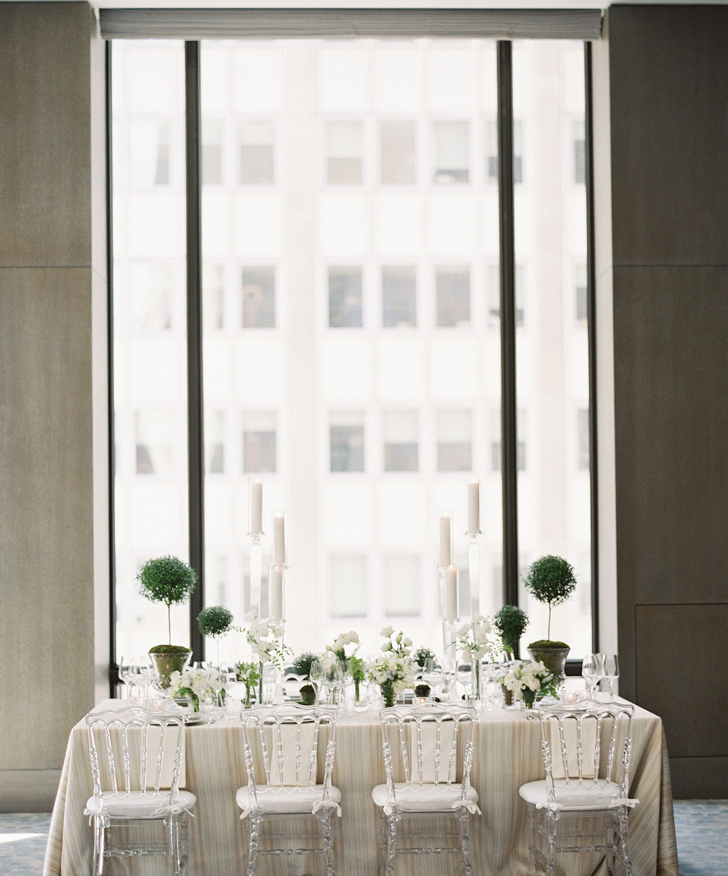 In the heart of the Financial District, where sleek lines and modern elegance meet, the Four Seasons Hotel set the stage for a celebration that balanced timeless romance with contemporary style. The couple’s vision was crisp and sophisticated, with a refined white-and-green palette evoking the charm of an English garden. The subtly aromatic recipe of flowers included Lilac, lightly scented Freesia, and fluttering Sweet Peas—all so delicately composed, as if plucked from a meadow. They complemented stately myrtle topiaries in varying sizes, all potted in unexpected highbrow crystal vases. Modern faceted crystal votives and towering candlesticks cast a soft, glistening glow among the garden flowers, creating an ethereal atmosphere.