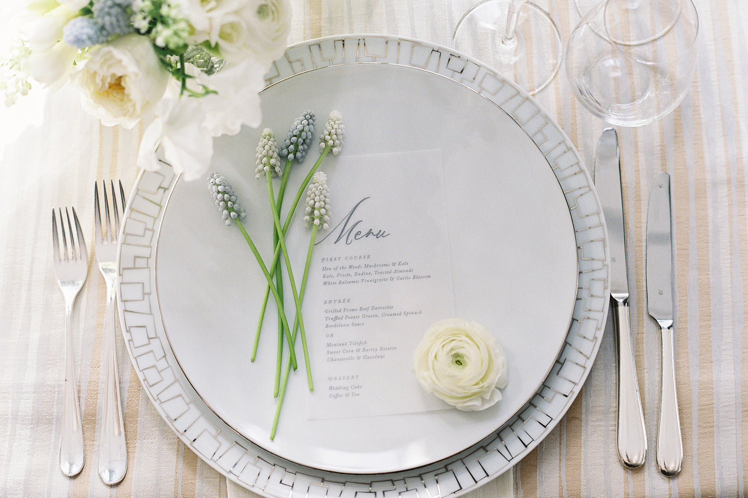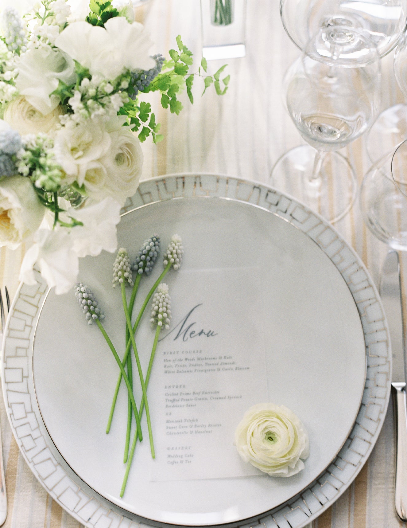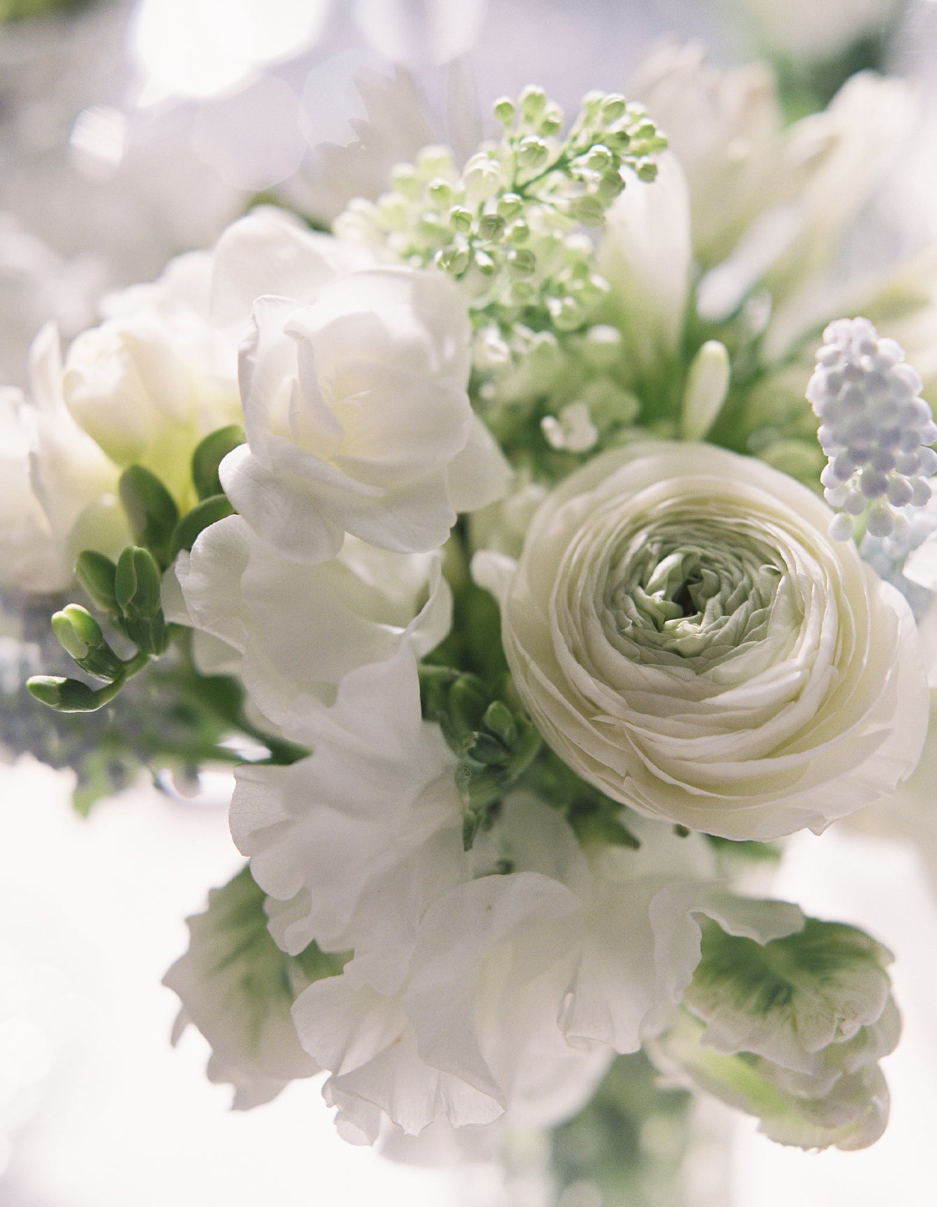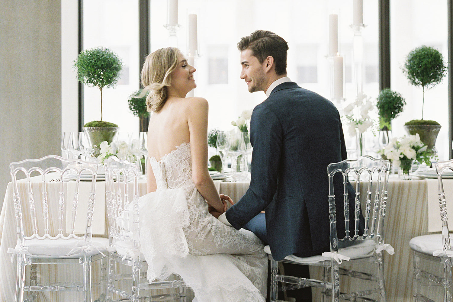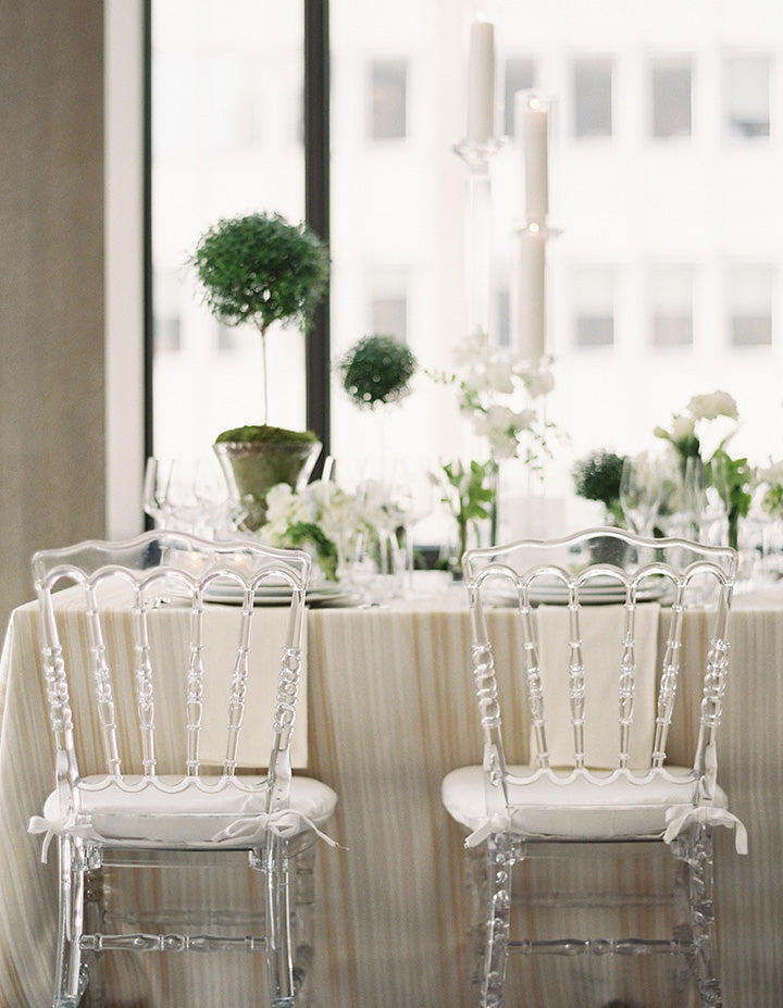 In the heart of the Financial District, where sleek lines and modern elegance meet, the Four Seasons Hotel set the stage for a celebration that balanced timeless romance with contemporary style. The couple’s vision was crisp and sophisticated, with a refined white-and-green palette evoking the charm of an English garden. The subtly aromatic recipe of flowers included Lilac, lightly scented Freesia, and fluttering Sweet Peas—all so delicately composed, as if plucked from a meadow. They complemented stately myrtle topiaries in varying sizes, all potted in unexpected highbrow crystal vases. Modern faceted crystal votives and towering candlesticks cast a soft, glistening glow among the garden flowers, creating an ethereal atmosphere.