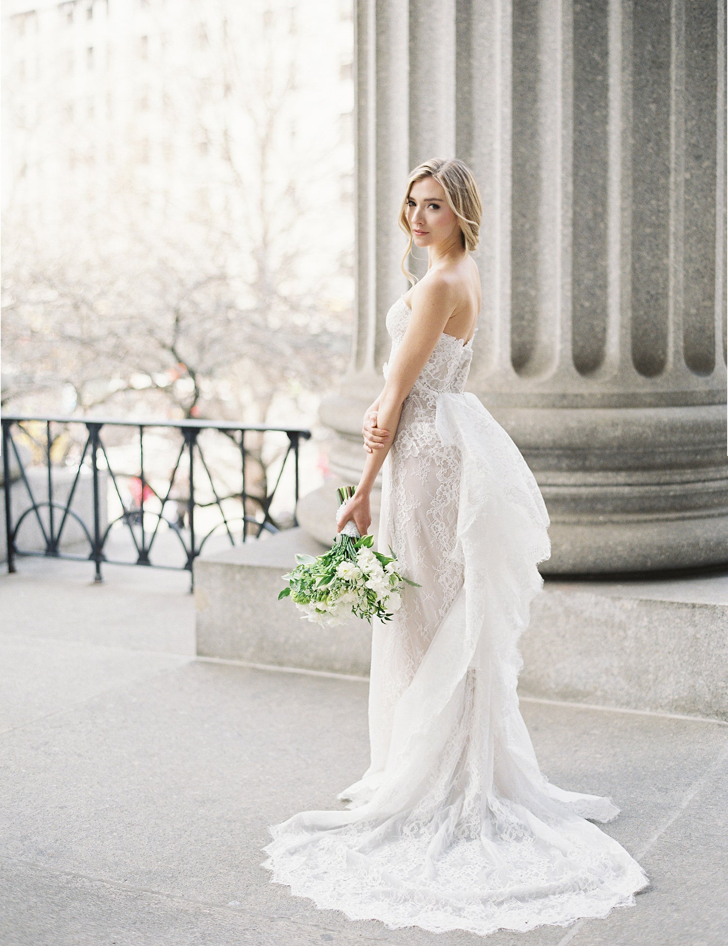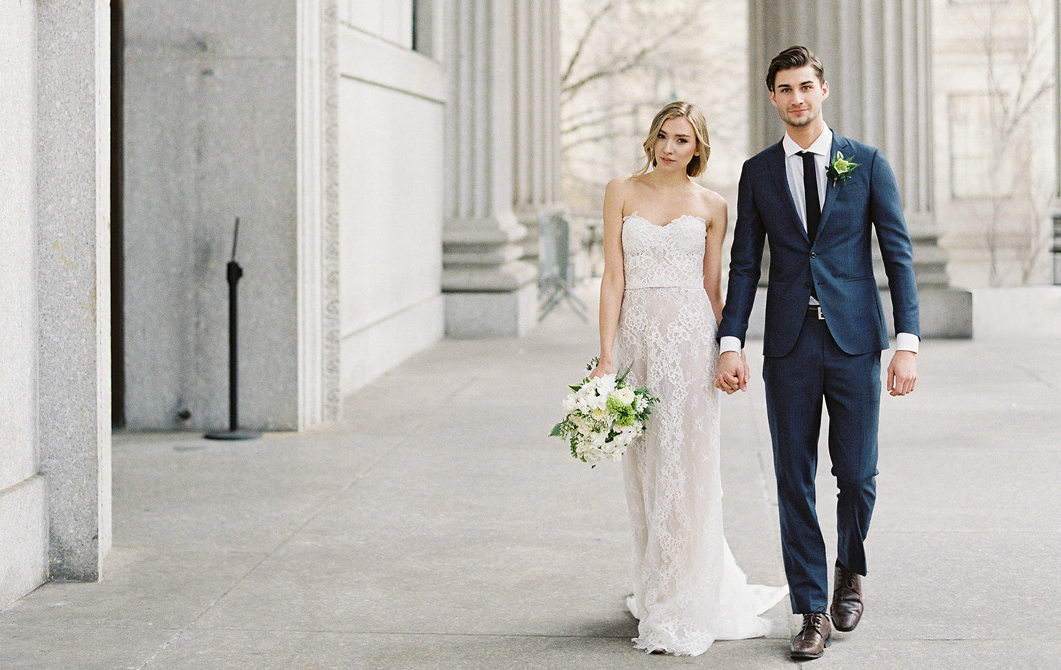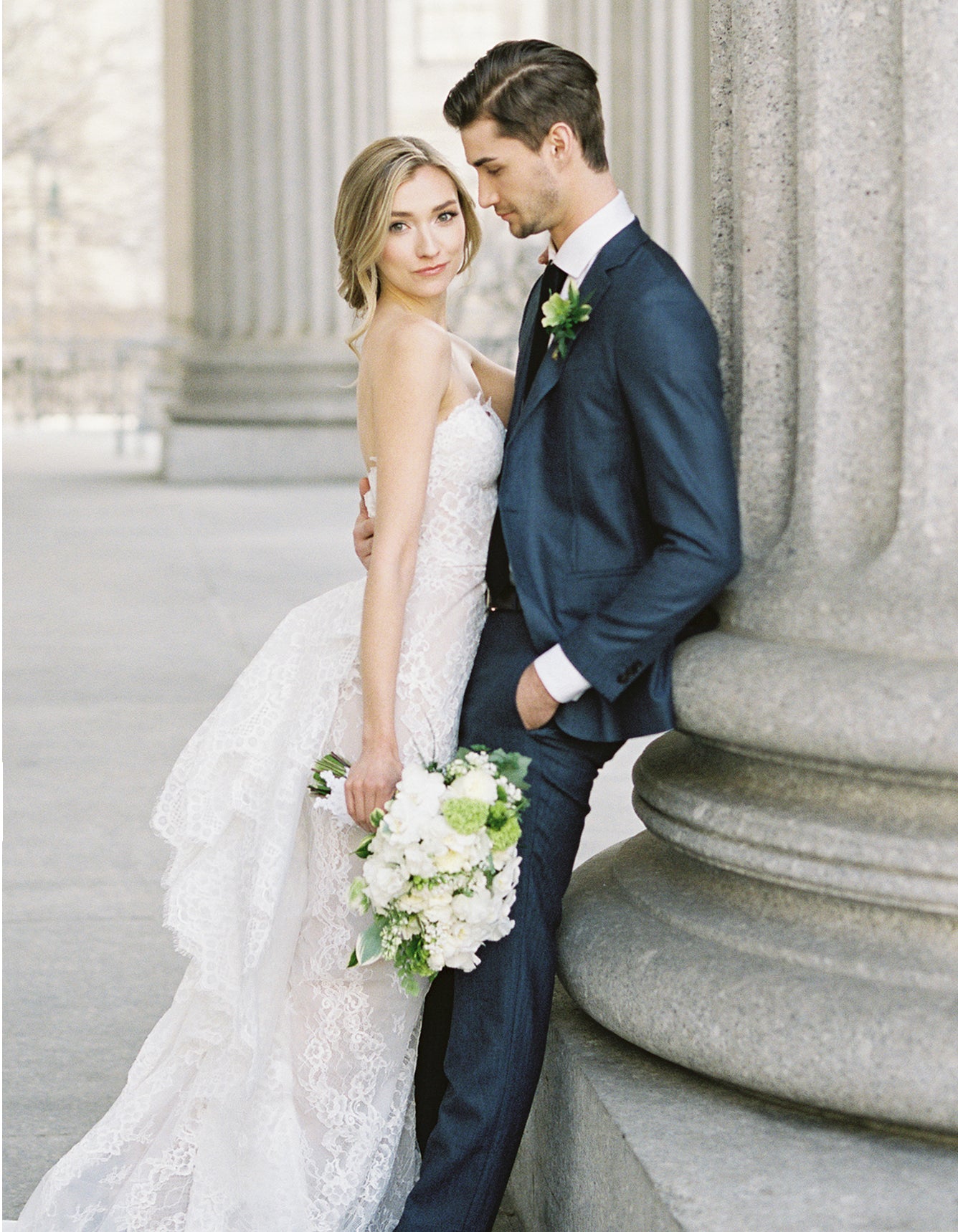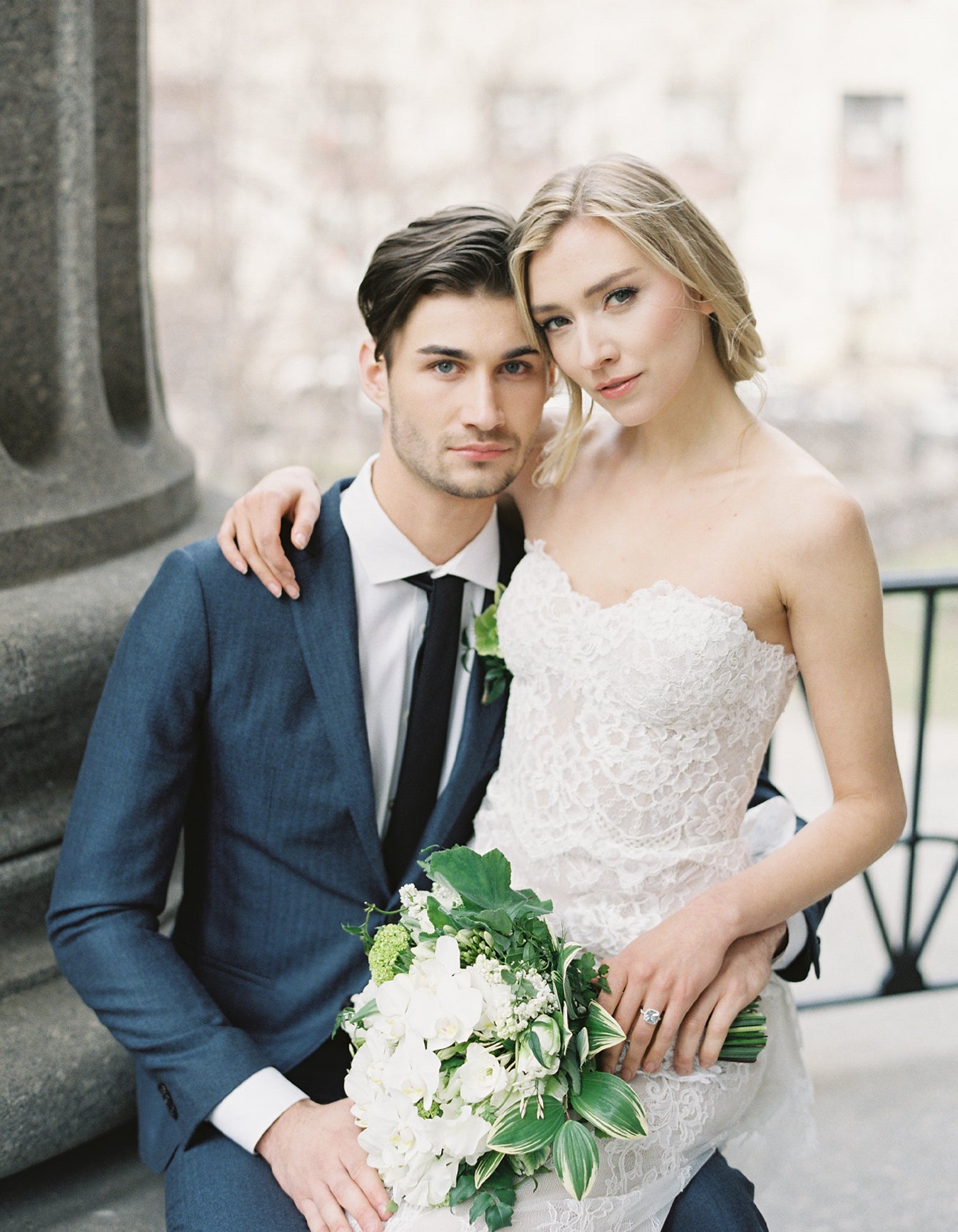 In the heart of the Financial District, where sleek lines and modern elegance meet, the Four Seasons Hotel set the stage for a celebration that balanced timeless romance with contemporary style. The couple’s vision was crisp and sophisticated, with a refined white-and-green palette evoking the charm of an English garden. The subtly aromatic recipe of flowers included Lilac, lightly scented Freesia, and fluttering Sweet Peas—all so delicately composed, as if plucked from a meadow. They complemented stately myrtle topiaries in varying sizes, all potted in unexpected highbrow crystal vases. Modern faceted crystal votives and towering candlesticks cast a soft, glistening glow among the garden flowers, creating an ethereal atmosphere.