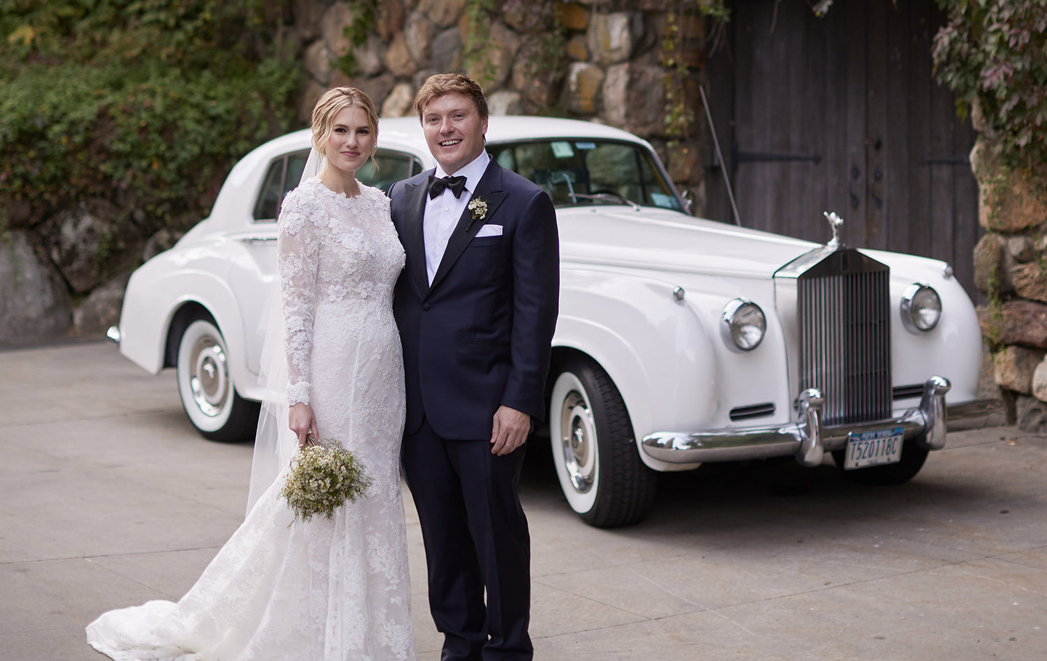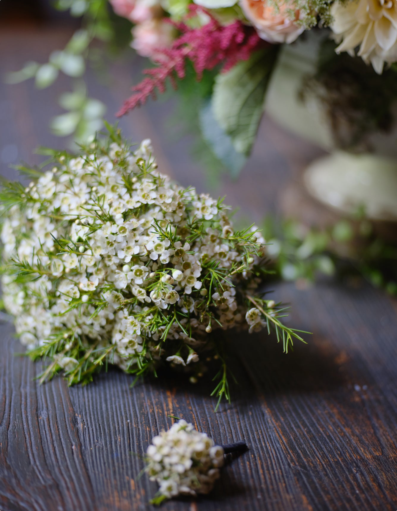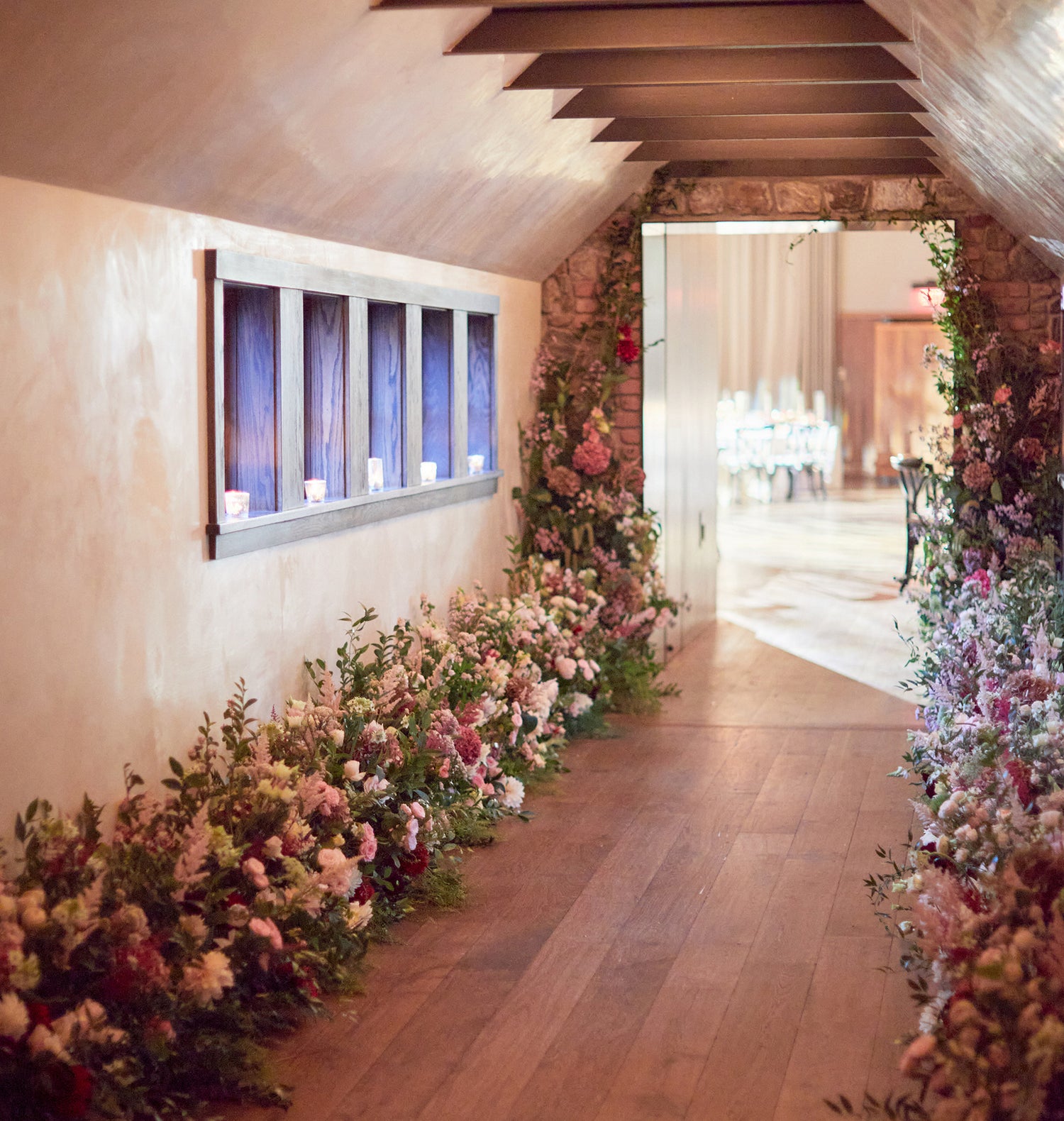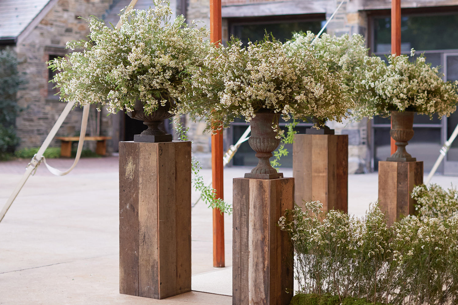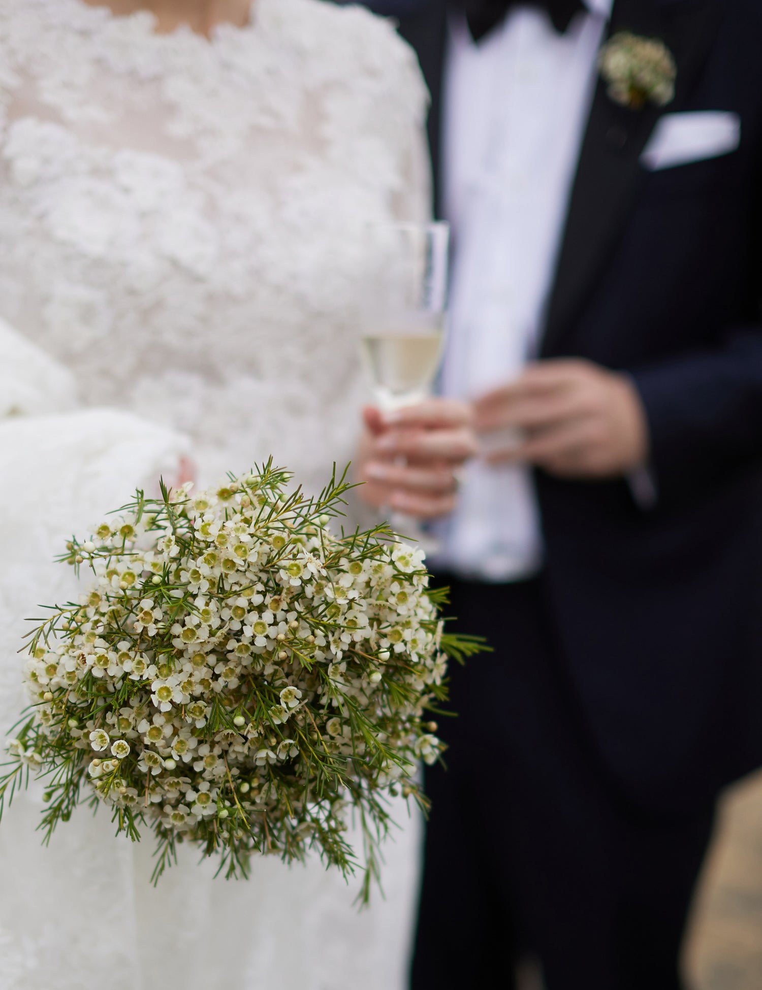 Set against the stunning backdrop of Blue Hill at Stone Barns, one of the region’s most renowned farm-to-table estates, this wedding brought the best of both worlds—glamour and rustic charm. High school sweethearts at heart, the couple arrived in a pristine white Rolls Royce, bringing an air of polish to the countryside, yet their effortless connection spoke volumes of their down-to-earth nature. The bride’s favorite flower, Wax Flower, became the ceremony flower of choice. Its delicate blooms, so country in essence, took on an unexpected chicness when woven into every detail: a clutch of Wax Flower in her hands, a boutonniere on his lapel, and bushels and bales lining the natural sisal carpeted aisle, transforming the tented courtyard. The Wax Flowers, in their abundance, even attracted butterflies, as if nature itself were joining in on the celebration.
