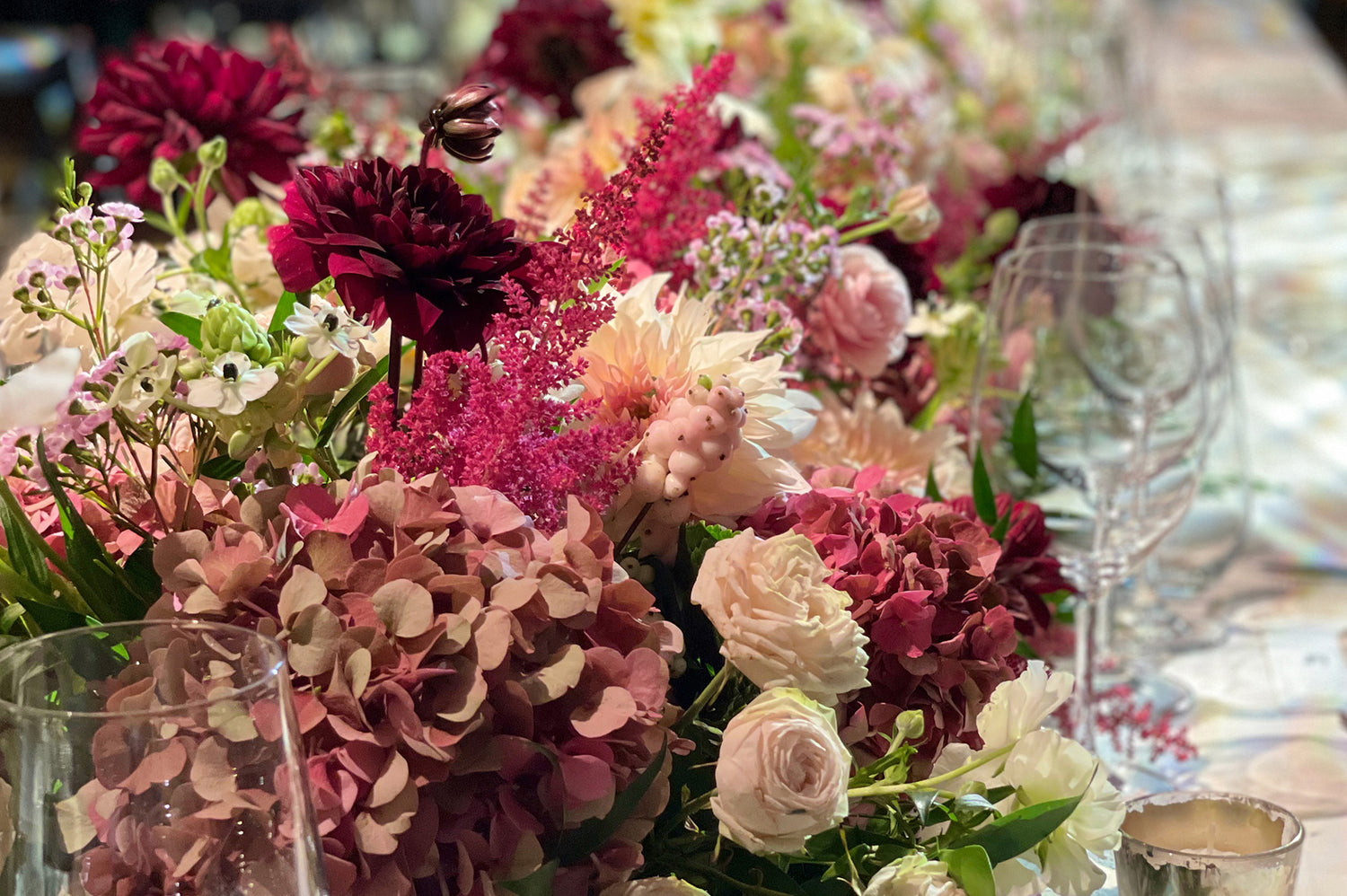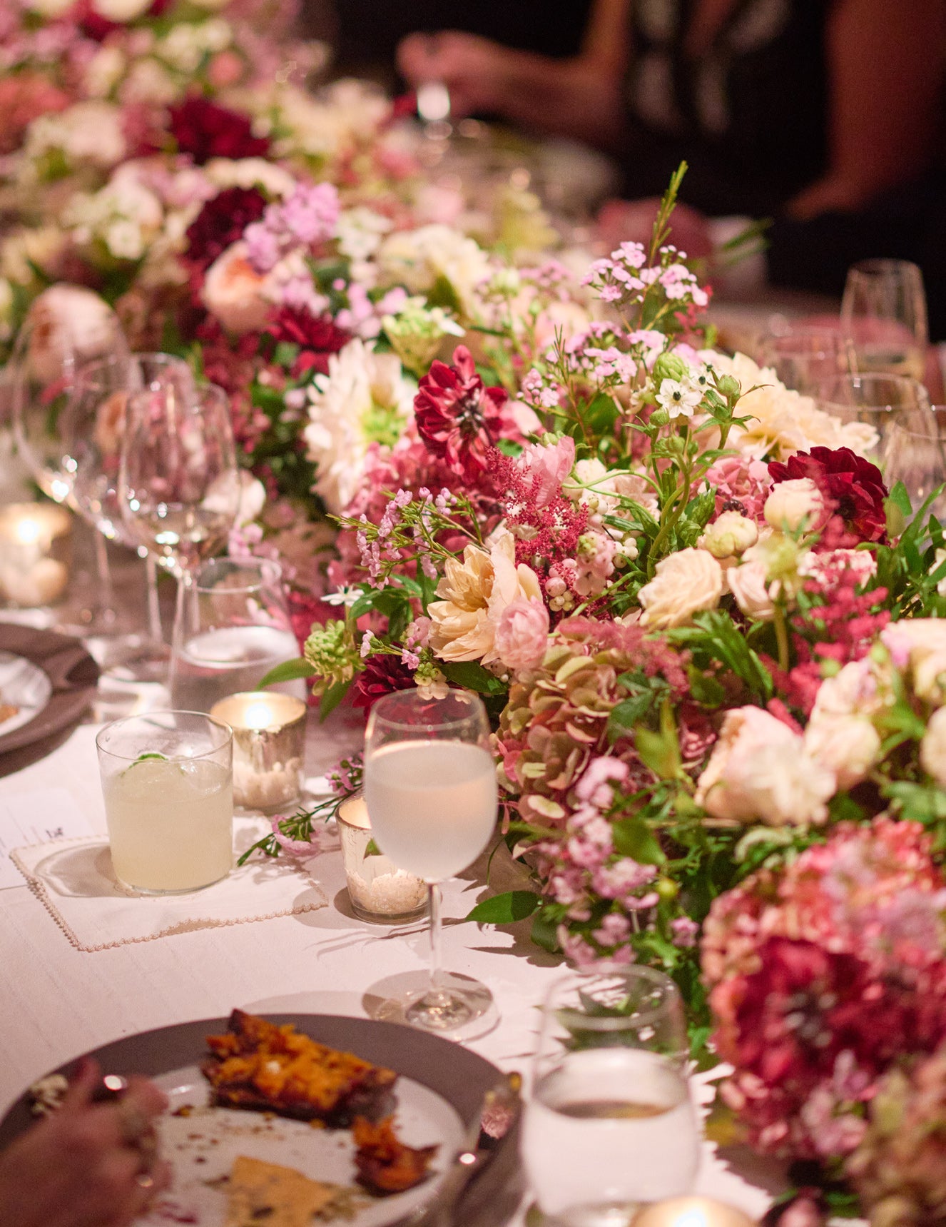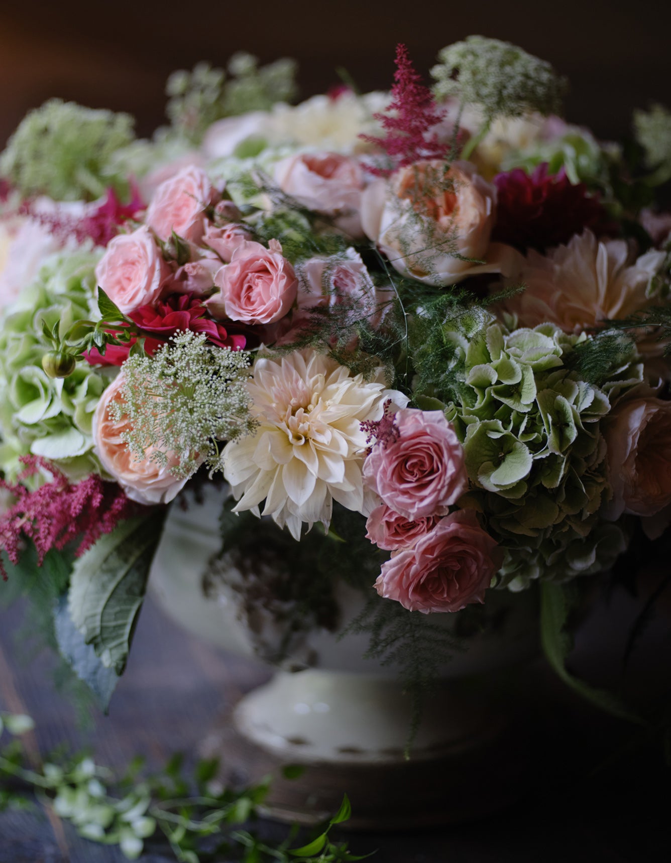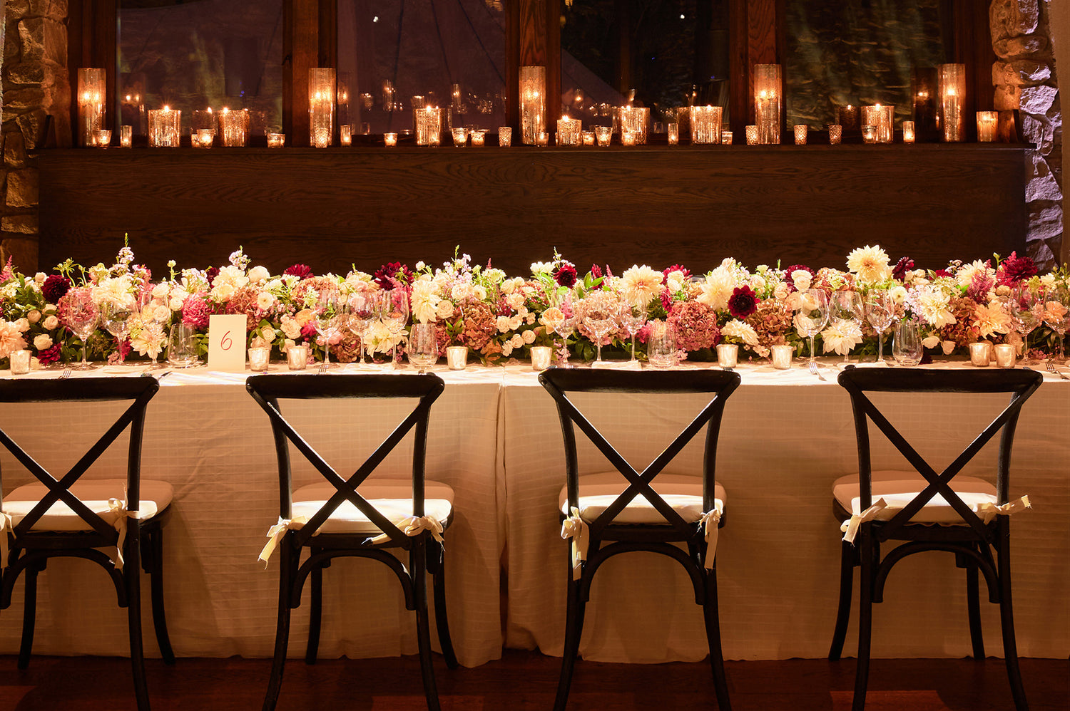After the intimate ceremony, guests made their way to the HayLoft, where the warmth of the space was enhanced by the couple’s carefully curated palette of soft peach, dusty rose, rich merlot, and lush garden greens. The loft’s beamed ceilings paired with cross-back wooden chairs, while low floral arrangements allowed for conversation to flow freely. Dahlias from a local organic farm, tinged Hydrangeas, white Winterberries, and feathery Astilbe created an intimate garden vibe, while some tables showcased floral-scape garlands that stretched from one end to the other. Others were dotted with flowers, interspersed with the glow of tall celery green taper candles set in antique silver candlesticks, surrounded by silver mercury glass votives in various sizes creating a warm and inviting ambiance.