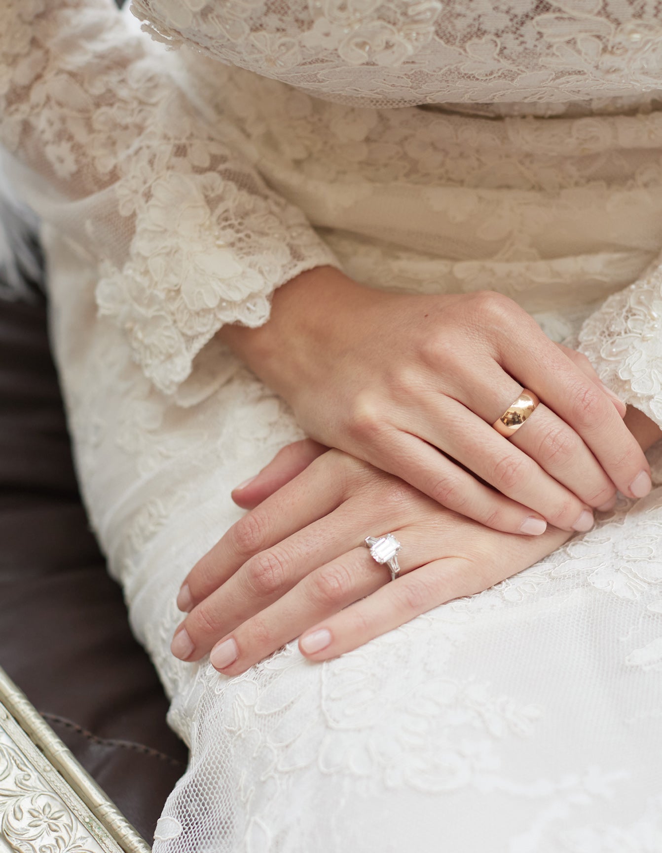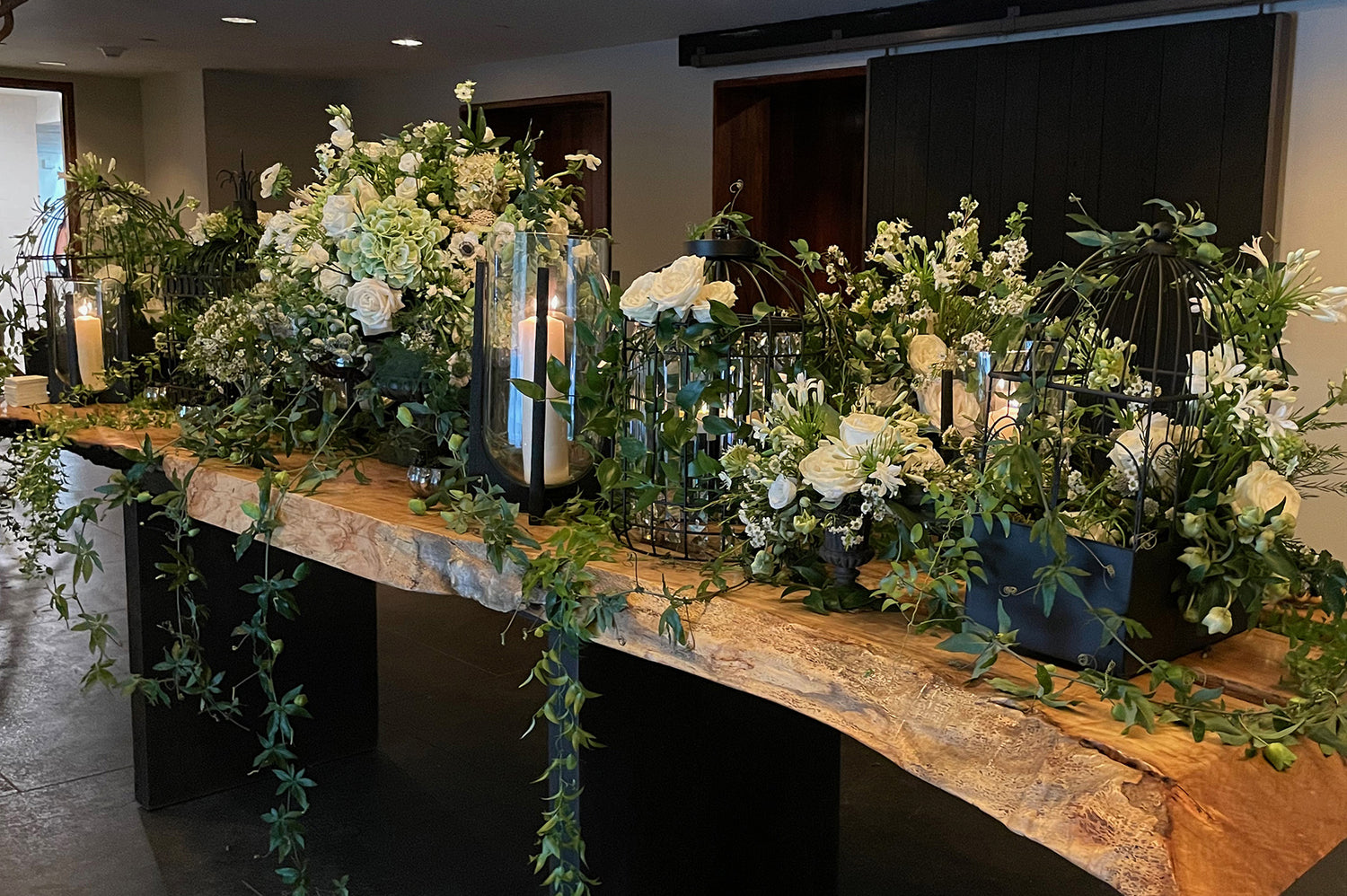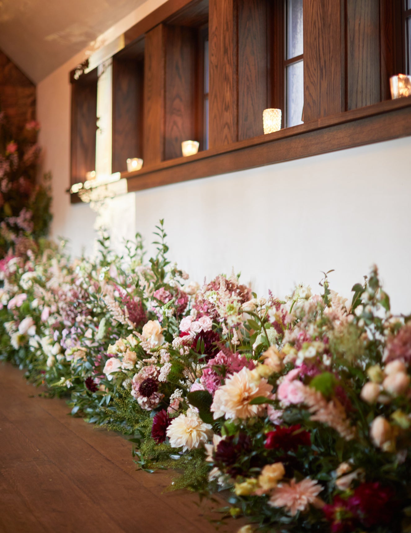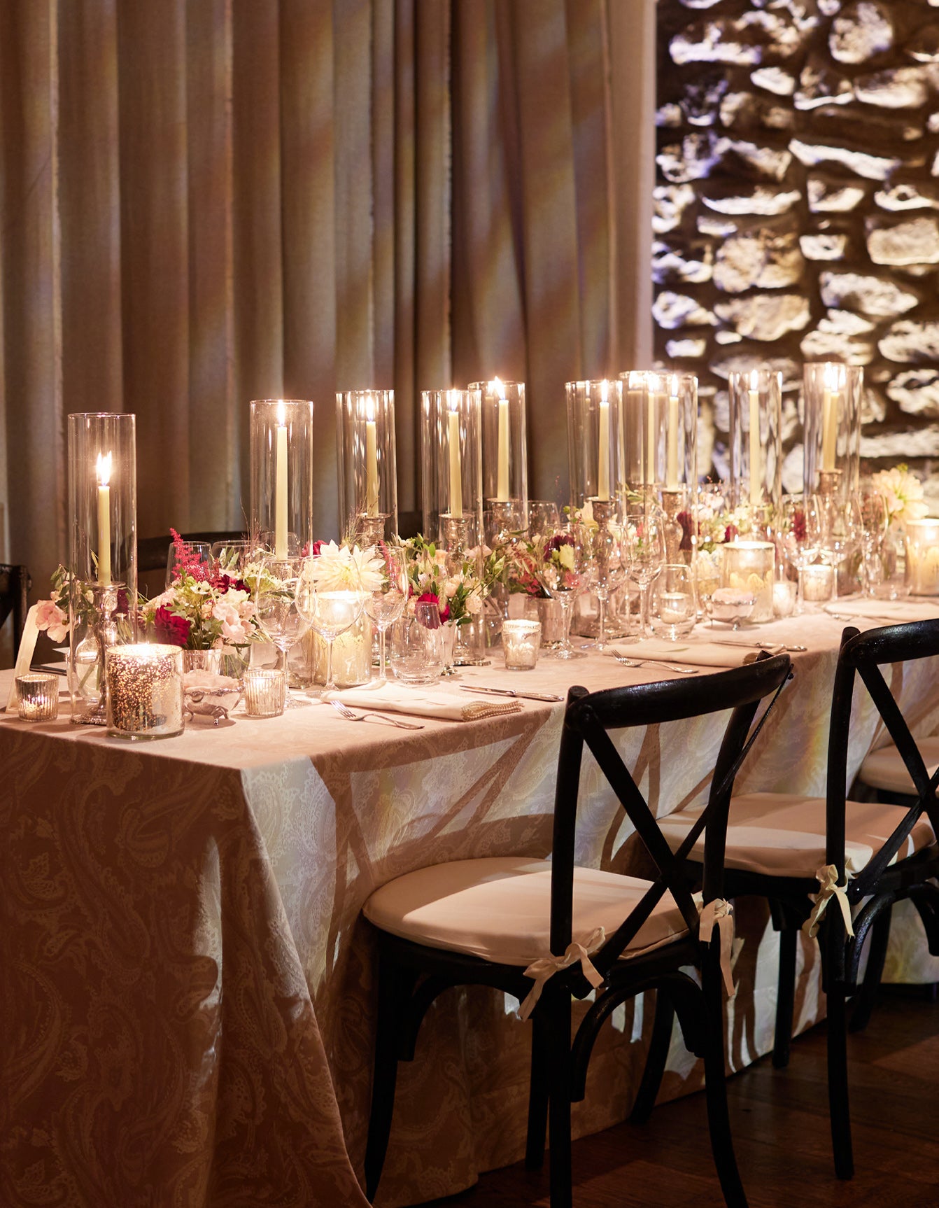 After the intimate ceremony, guests made their way to the HayLoft, where the warmth of the space was enhanced by the couple’s carefully curated palette of soft peach, dusty rose, rich merlot, and lush garden greens. The loft’s beamed ceilings paired with cross-back wooden chairs, while low floral arrangements allowed for conversation to flow freely. Dahlias from a local organic farm, tinged Hydrangeas, white Winterberries, and feathery Astilbe created an intimate garden vibe, while some tables showcased floral-scape garlands that stretched from one end to the other. Others were dotted with flowers, interspersed with the glow of tall celery green taper candles set in antique silver candlesticks, surrounded by silver mercury glass votives in various sizes creating a warm and inviting ambiance.